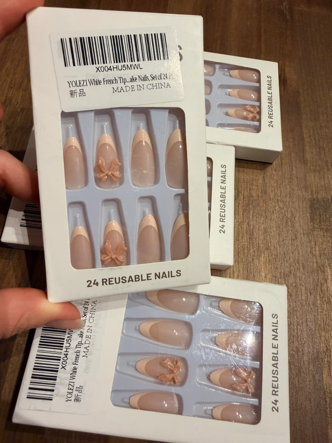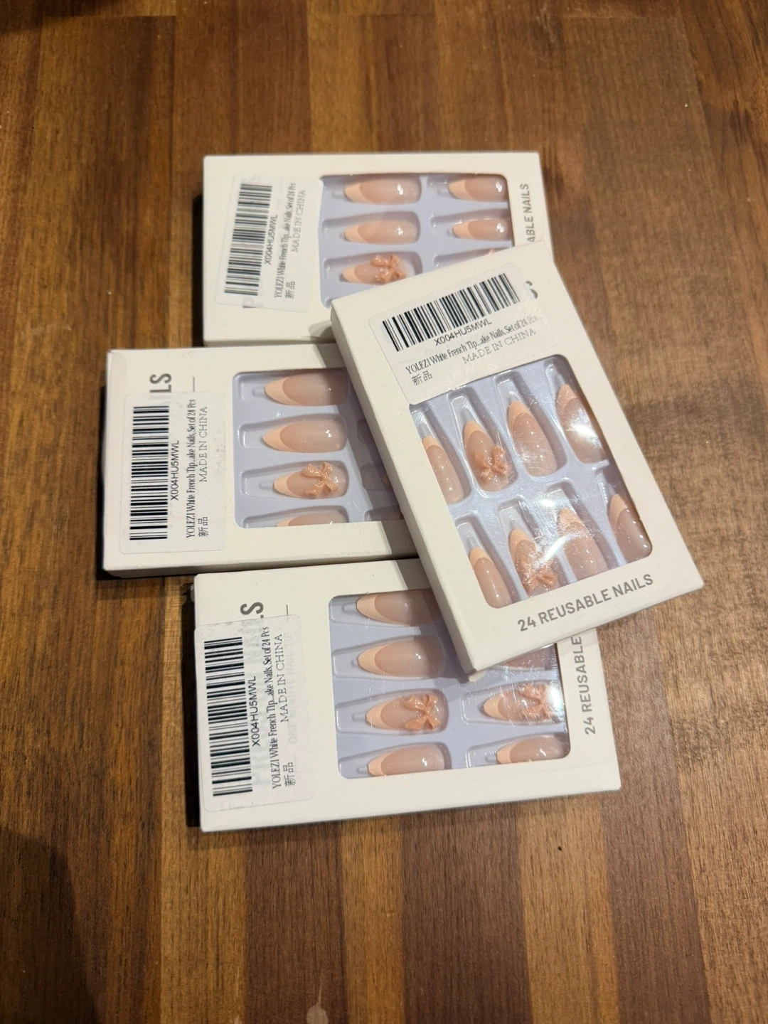 These are reusable French tip nails with a bow accent. Each set contains 24 nails. They're designed for a natural look and easy application.
