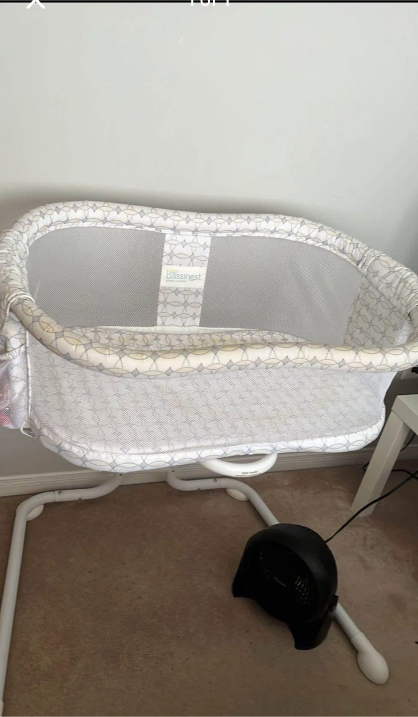 Bassinet bedside sleeper with a white and grey geometric pattern. It has mesh sides for ventilation. Suitable for newborns.