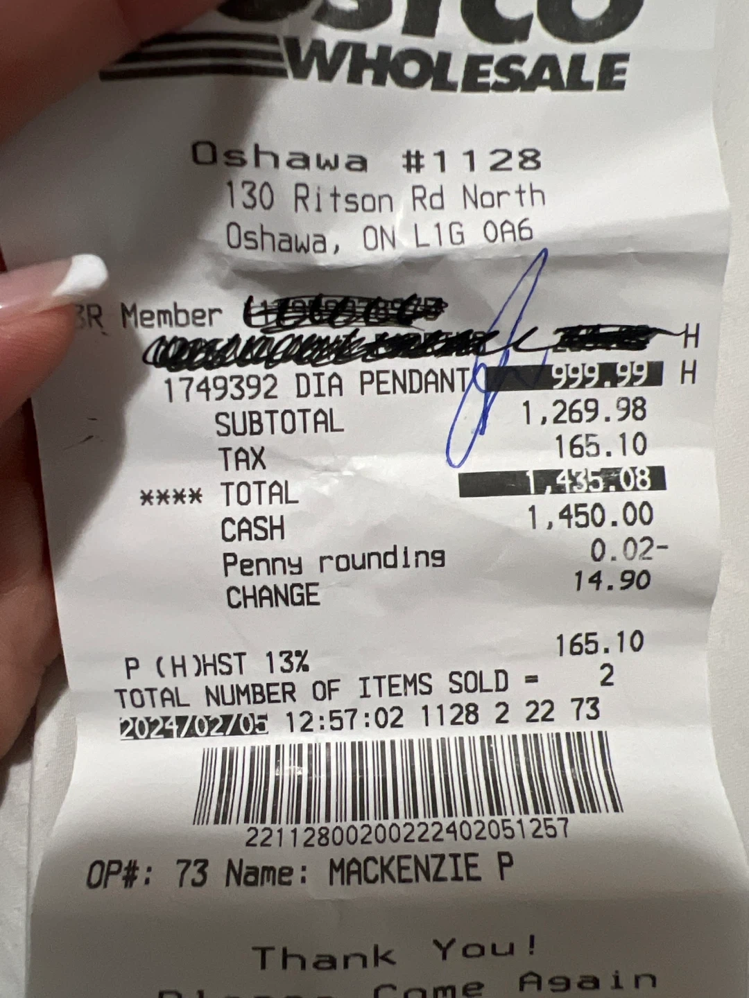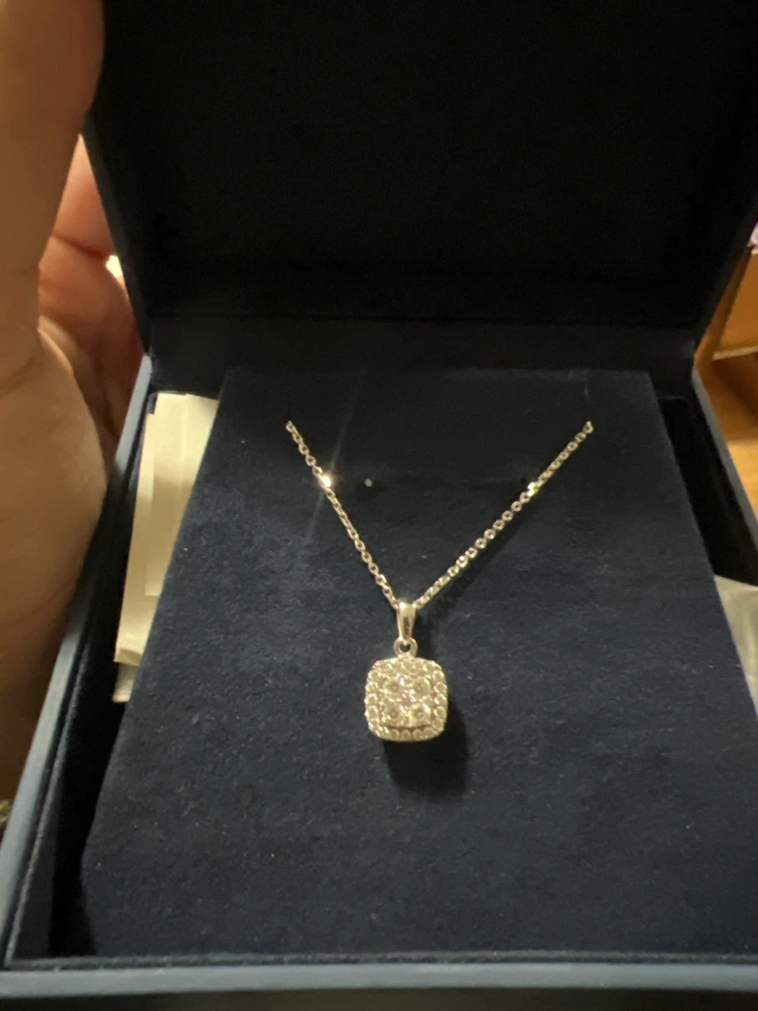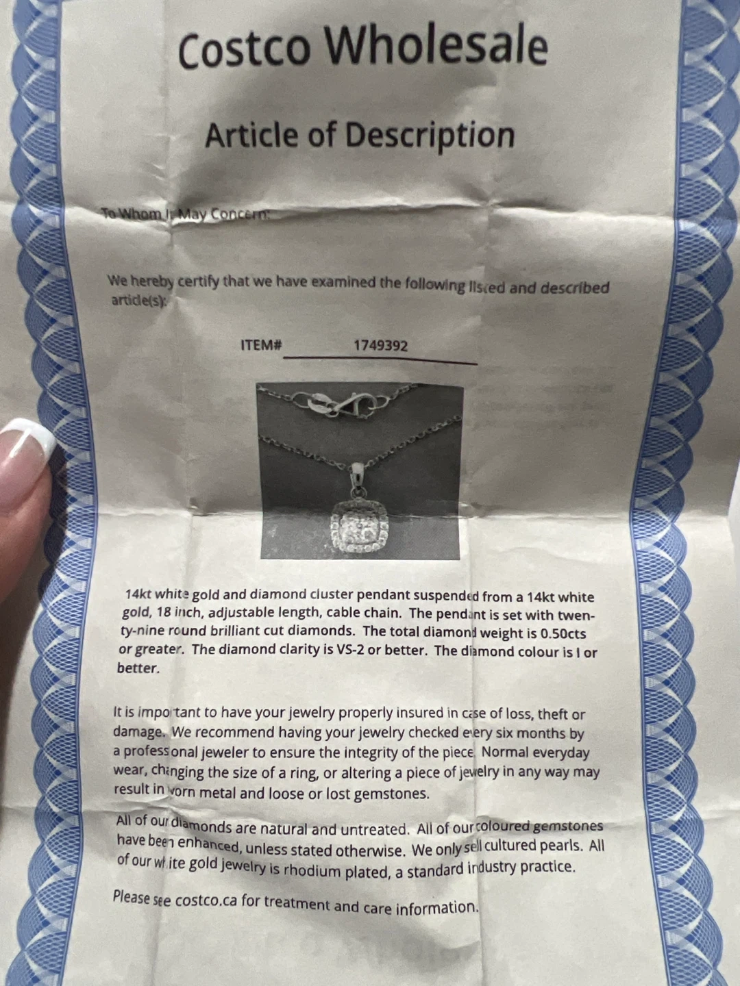 10Selling a beautiful 14kt white gold and diamond cluster pendant necklace from Costco! The pendant is set with twenty-nine round brilliant cut diamonds. The total diamond weight is 0.50cts or greater. The diamond clarity is VS-2 or better. The diamond colour is I or better. It has an 18 inch, adjustable length, cable chain. Originally bought for $999 plus tax at Costco. Given to me as a gift - never worn