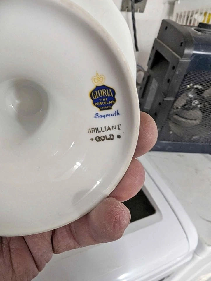 I believe it's real gold and porcelain. Would make a great candy dish or table centerpiece. Porch pickup in Port Hope, or can meet halfway if it sells for my asking price of $50.