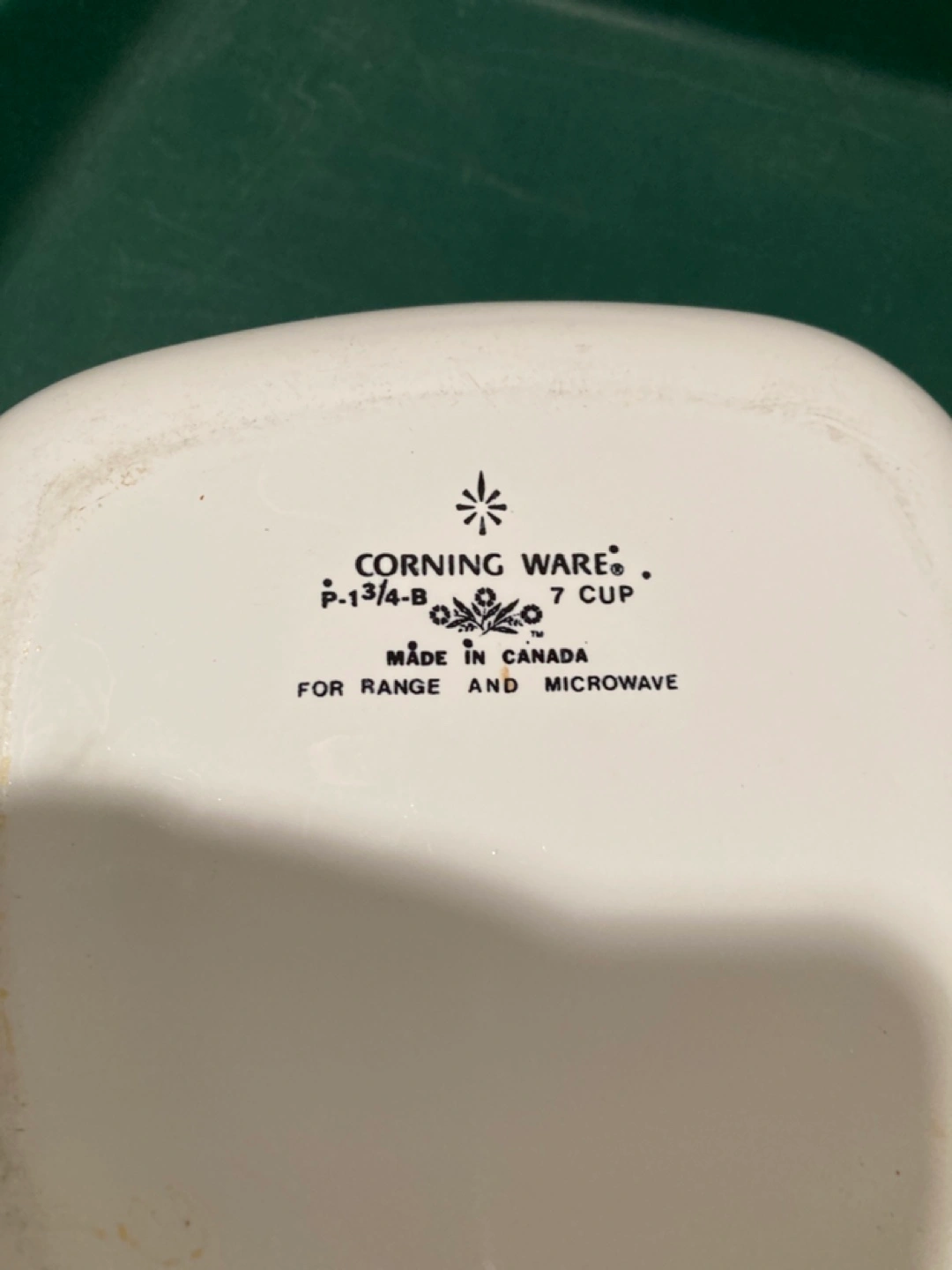 Blue flower pattern. Glass lid. Made in Canada. For range and microwave use. Square shape. White base.
