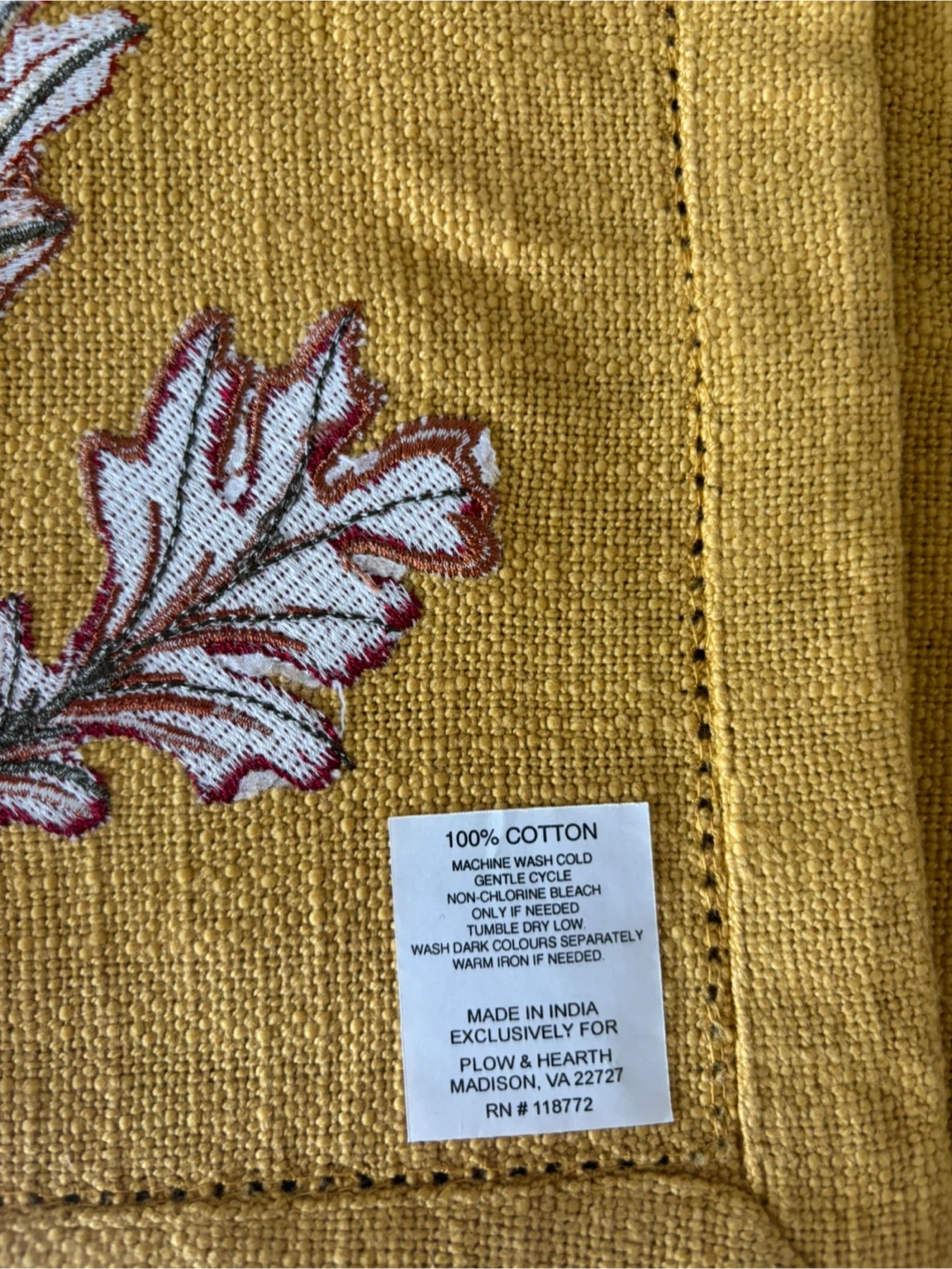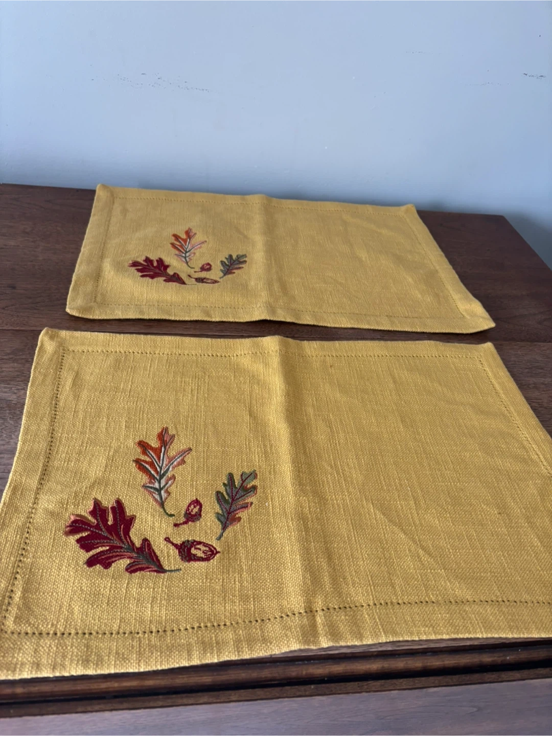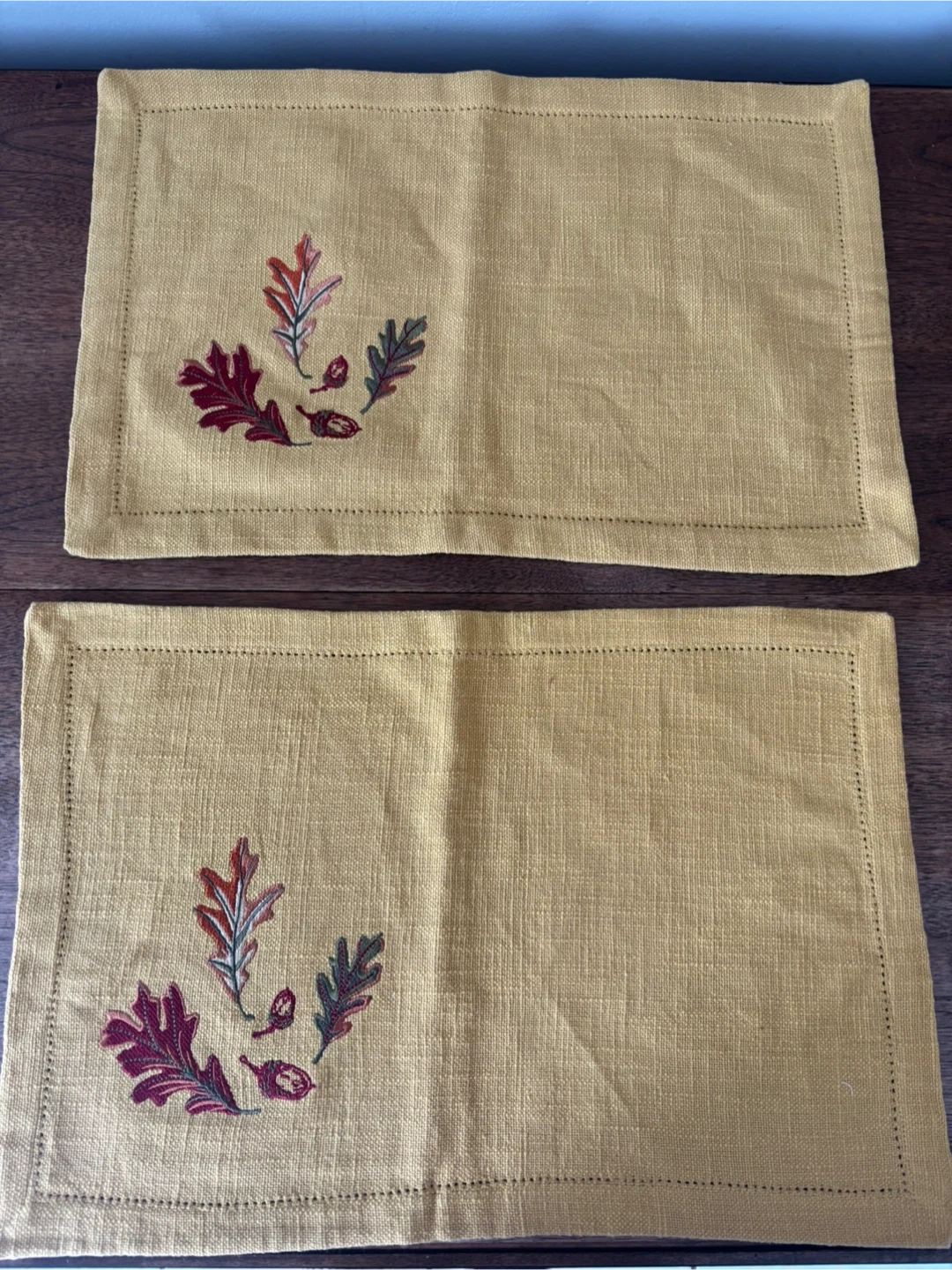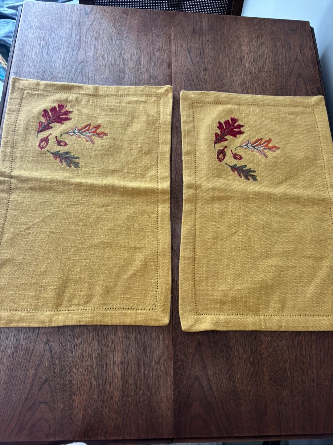 Two yellow cotton placemats featuring embroidered autumn leaves. 100% cotton material. Never used, in new condition and comes with original packaging. 20” by 14”. Cash only.