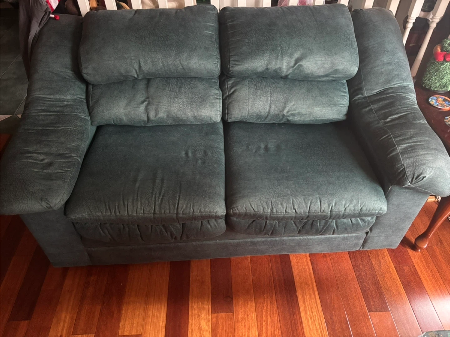 Comfortable green loveseat and three seater couch in good condition. Perfect for a living room or apartment. The colour is a nice, muted, phthalo green that would go well with many decor styles