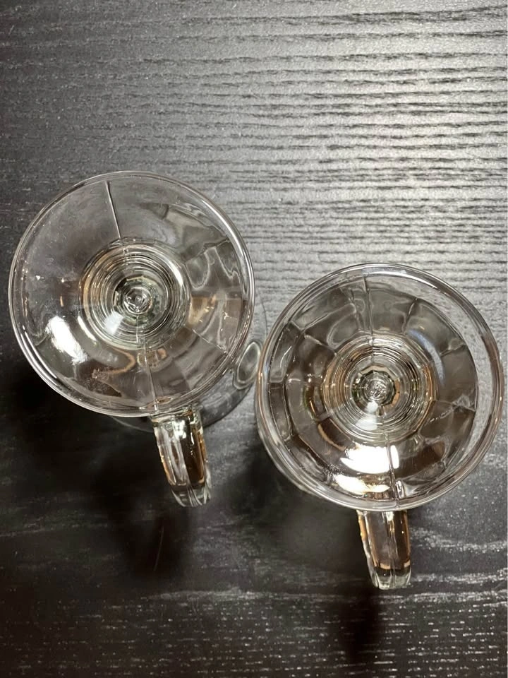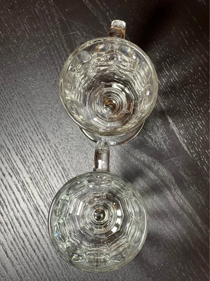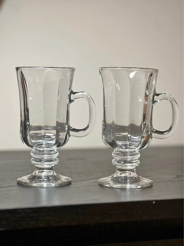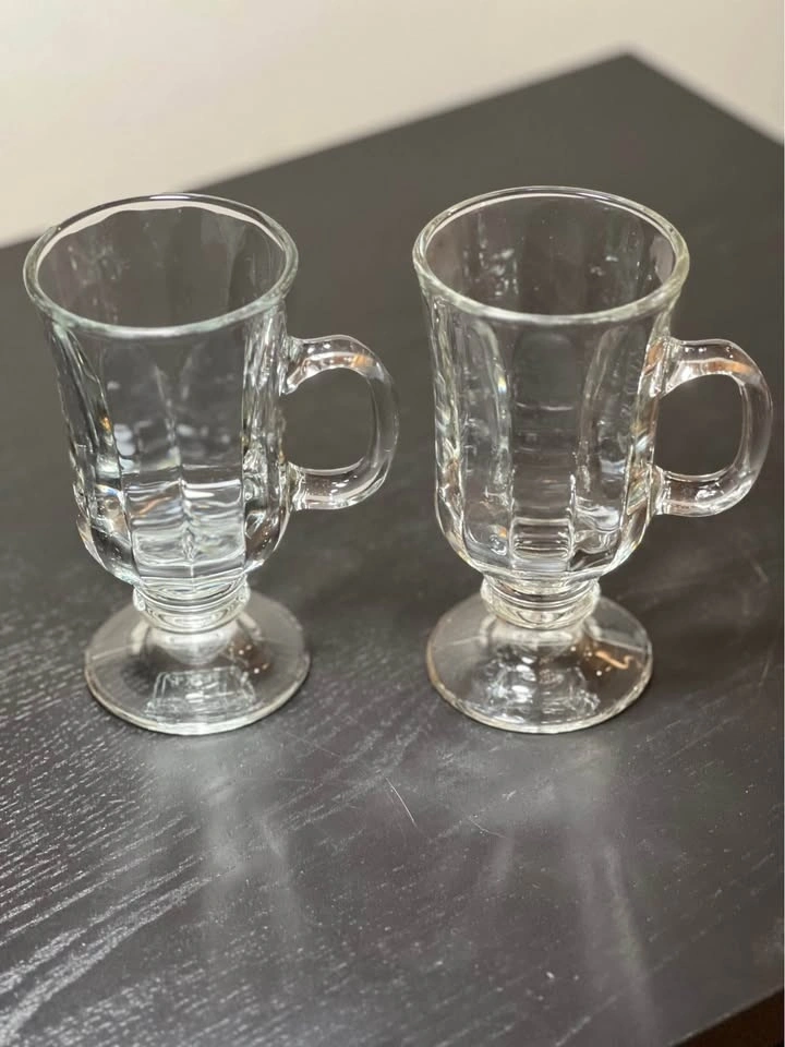 Two Libbey Milan Irish Coffee Mugs. These clear glass mugs feature a paneled design and a pedestal base. They hold 8 to 8.5 ounces and are dishwasher safe. Perfect for Irish coffee, cappuccinos, or other hot beverages. Pre-owned. Pickup is at 58th and 7th Ave in Midtown Manhattan.