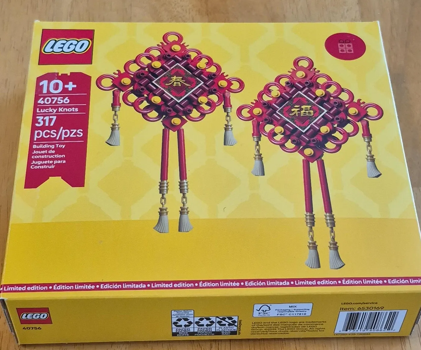 This LEGO set features the 40756 Lucky Knots with 317 pieces. It's a building toy designed for ages 10 and up. The set includes components to construct decorative lucky knots, often associated with cultural celebrations.