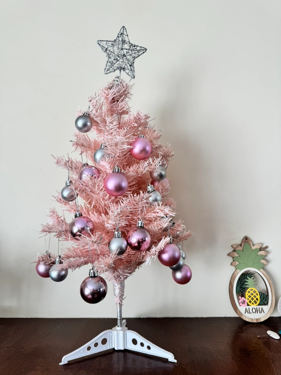 A cute pink Christmas tree, perfect for adding a touch of whimsy to your holiday decor! It comes with a variety of pink and silver ornaments, as well as string lights to make it extra festive