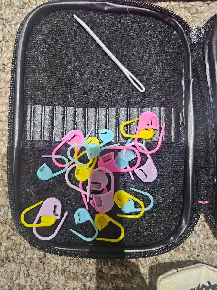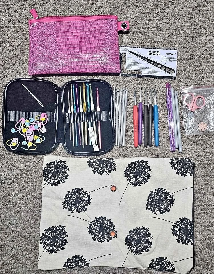 Awesome crochet hook set has everything you need to get started or add to your collection! Comes with stitch markers, mostly metal crochet hooks (except 3), little scissors, both pink zippered pouches, a fabric project bag, and a Red Heart knit check tool. Selling together. Public meetup only.