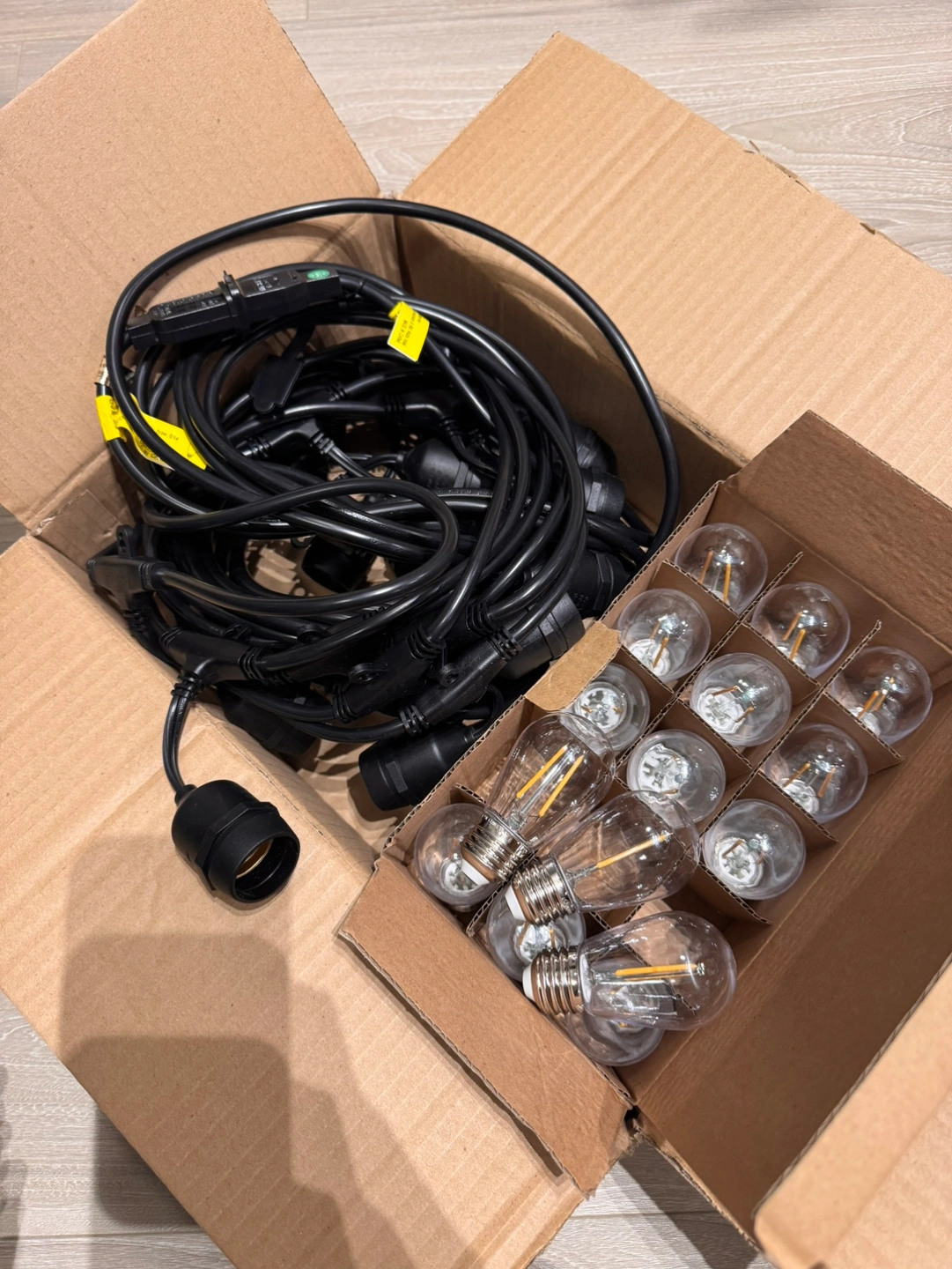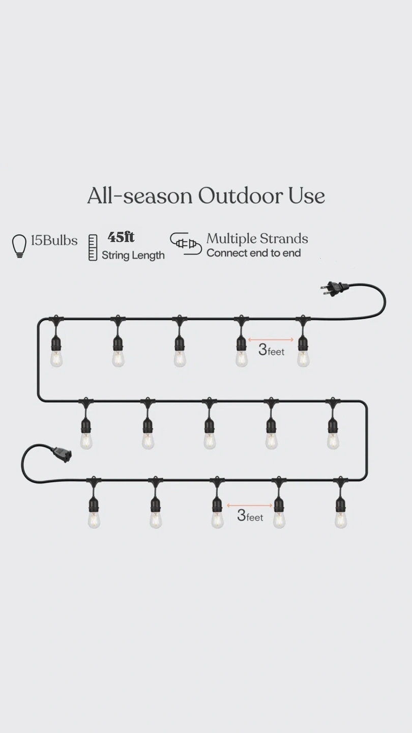 93I’m selling a set of Periolite string lights, perfect for indoor or outdoor use. Here are the details: *Rated for 120V/60Hz, supports up to 960 watts. *Works with various bulb types (standard E26 base). *Great for lighting up patios, parties, or home spaces. * contains 15 bulbs *warm lights * it is 45 ft string length *it is waterproof and windproof * it is resistant to low and high temperatures Btw, I have a few other items listed as well. Feel free to check them out and let me know if you're interested! 🥹✨