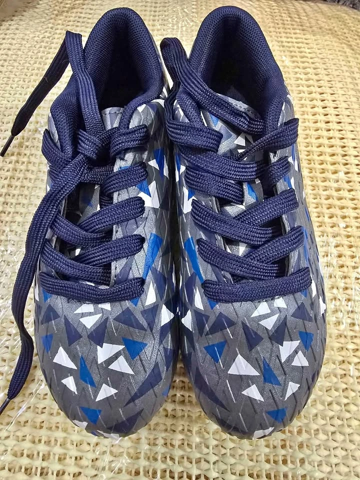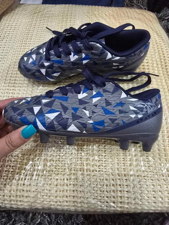 117Excellent for beginner soccer players Bold geometric design in navy, white, grey & blue Lightweight and flexible with molded cleats for great traction Size: US 1 / EUR 32 / UK 13 Brand new, never worn 📍Pickup in Mission