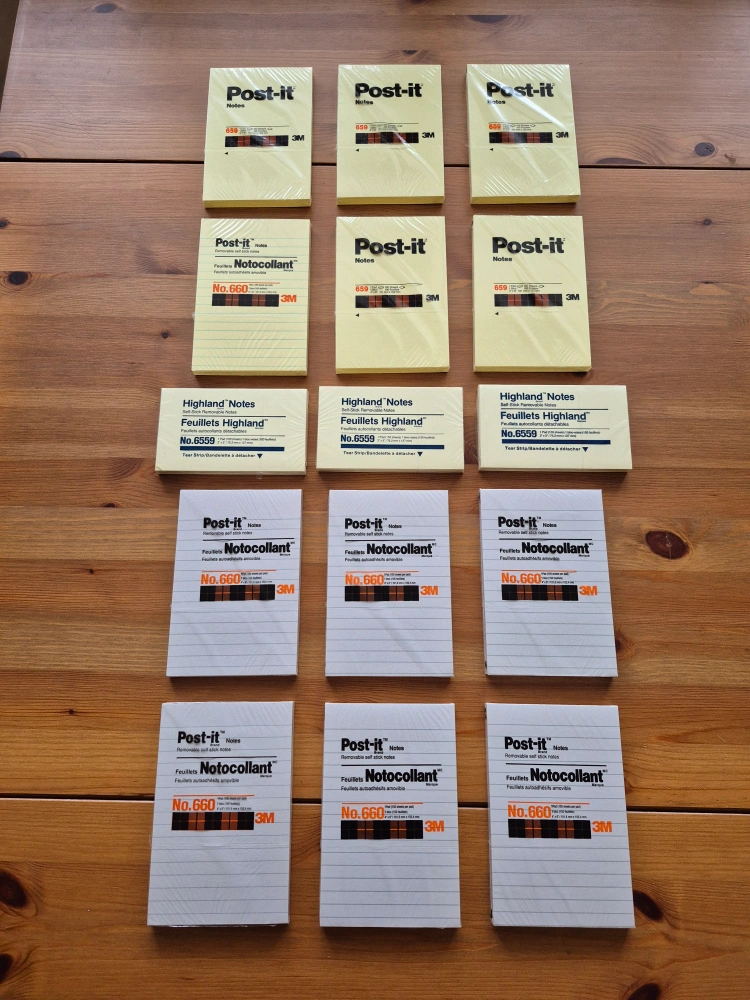 1000+The 12 bigger ones are Post-It brand, the 3 (slightly) smaller are Highland sticky notes. ALL are Brand New, still Shrink-Wrapped. Details: ◉ 12 Large 4"x 6" Post-It brand pads: ➜ 6 Classic Canary Yellow (1 Lined, 5 Unlined). ➜ 6 Pale Dove Grey (Lined). ◉ 3 Highland Notes 4"x 6" sticky notes pads: ➜ Classic Canary Yellow (Unlined). ➤ Total of 15 Brand New Large stickie notes pads. Price is for the lot (selling as a lot only). 👉 Pick up from Yonge & St Clair