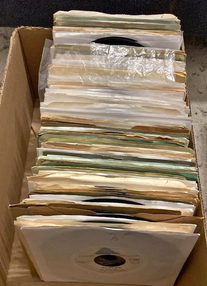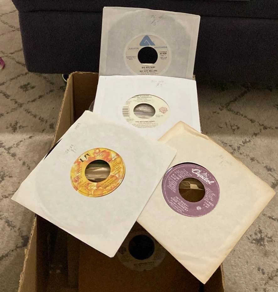 10150 45s in sleeves with music from 50s / 60s / 70s / 80s with some big name artists. There is definitely value here. Rod Stewart, Bay City Rollers, 10 cc, Burton Cummings, Anne Murray, Kenny Rogers, Boz Scaggs, Barbara Streisand, Paul Revere, Rick Springfield, Johnny Mathis, Dolly Parton, Donovan, and many more Pickup in Oakville