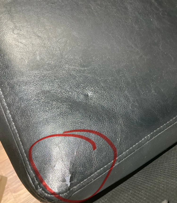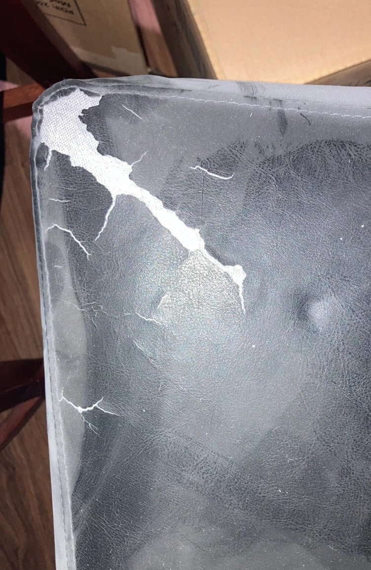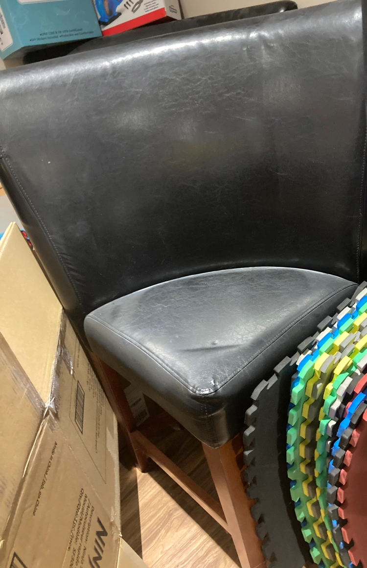 Two three-legged bar height chairs. Has some dust on it and a little bit of peeling of the cover at the front corners (one worse than the other).