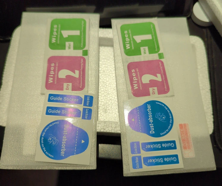 Two brand new glass screen protectors for iPhone 7 with guide stickers, dust remover sticker, wet and dry wipes for cleaning and the protectors themselves. Phone was given back to work so no longer can use them.