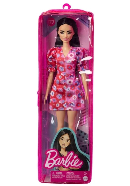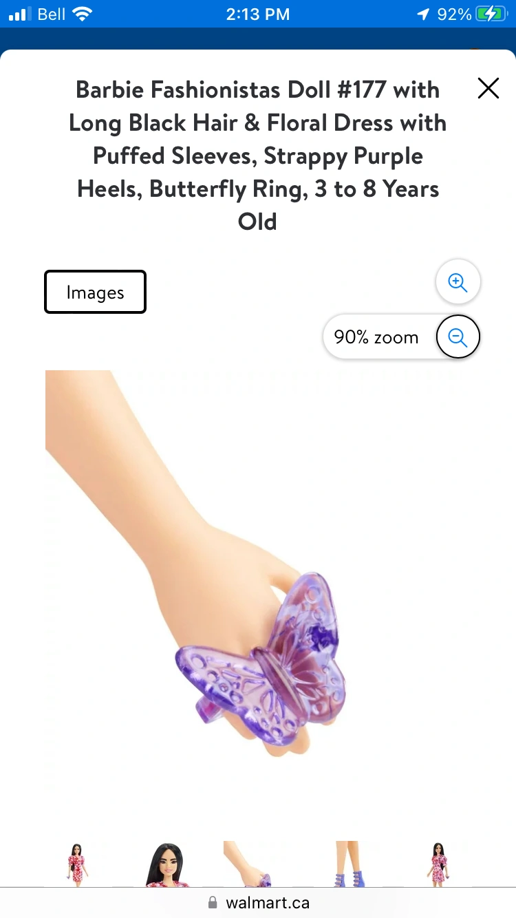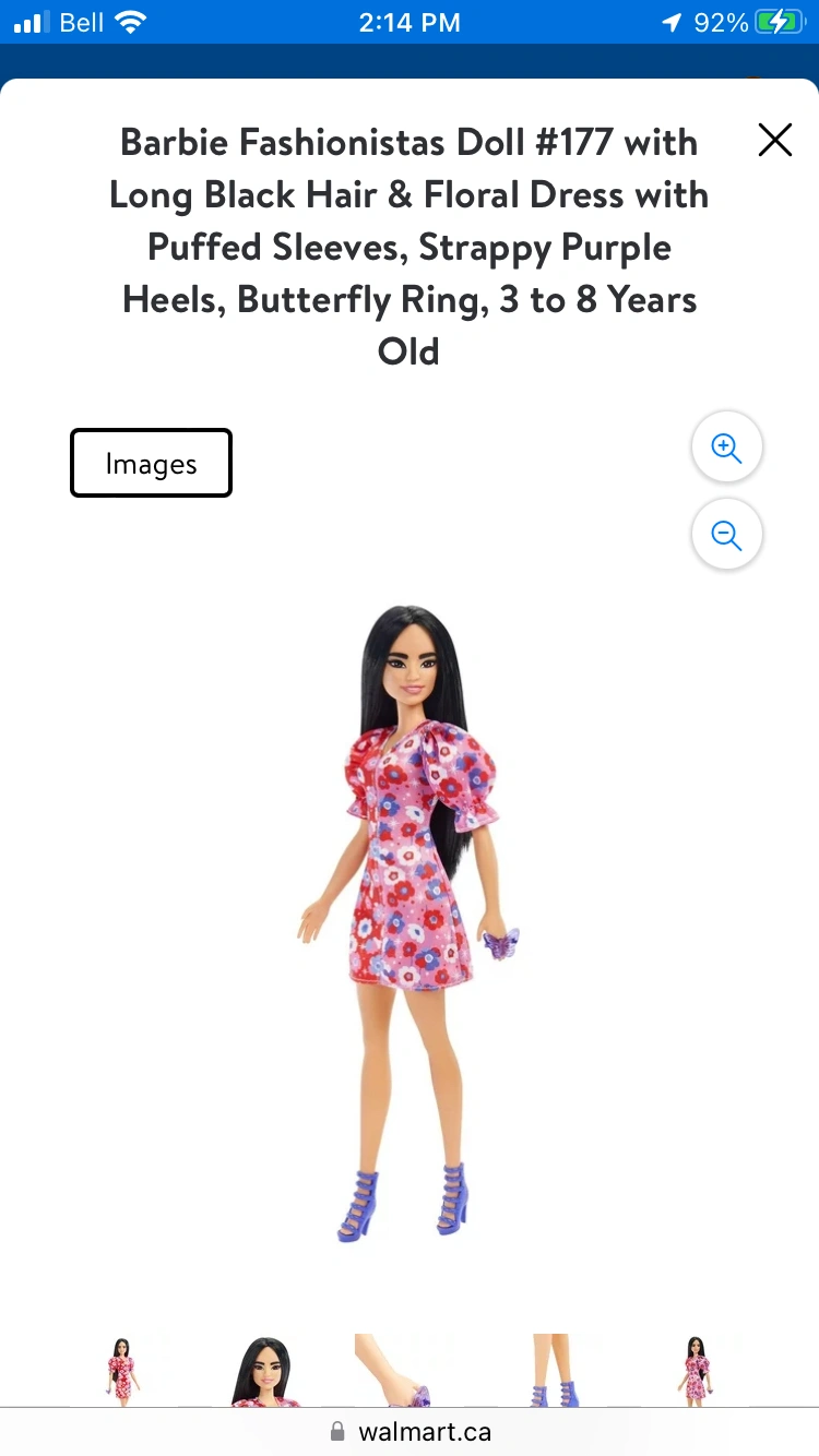 with Long Black Hair & Floral Dress with Puffed Sleeves, Strappy Purple Heels, Butterfly Ring