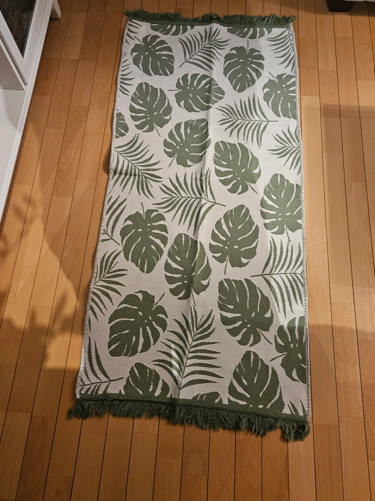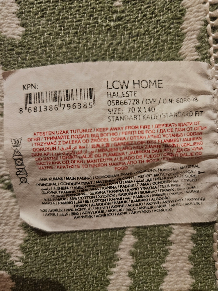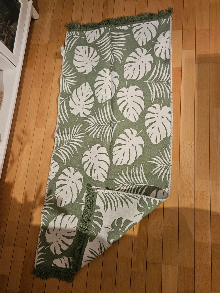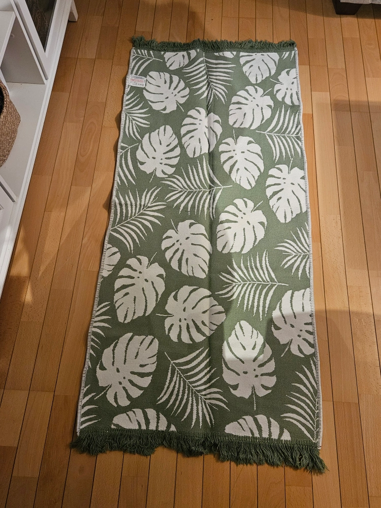 It is a machine-washable, beautiful Turkish kilim rug. Double-sided and different tones. 70×140 cm. Unfortunately, the size doesn't work for my place.