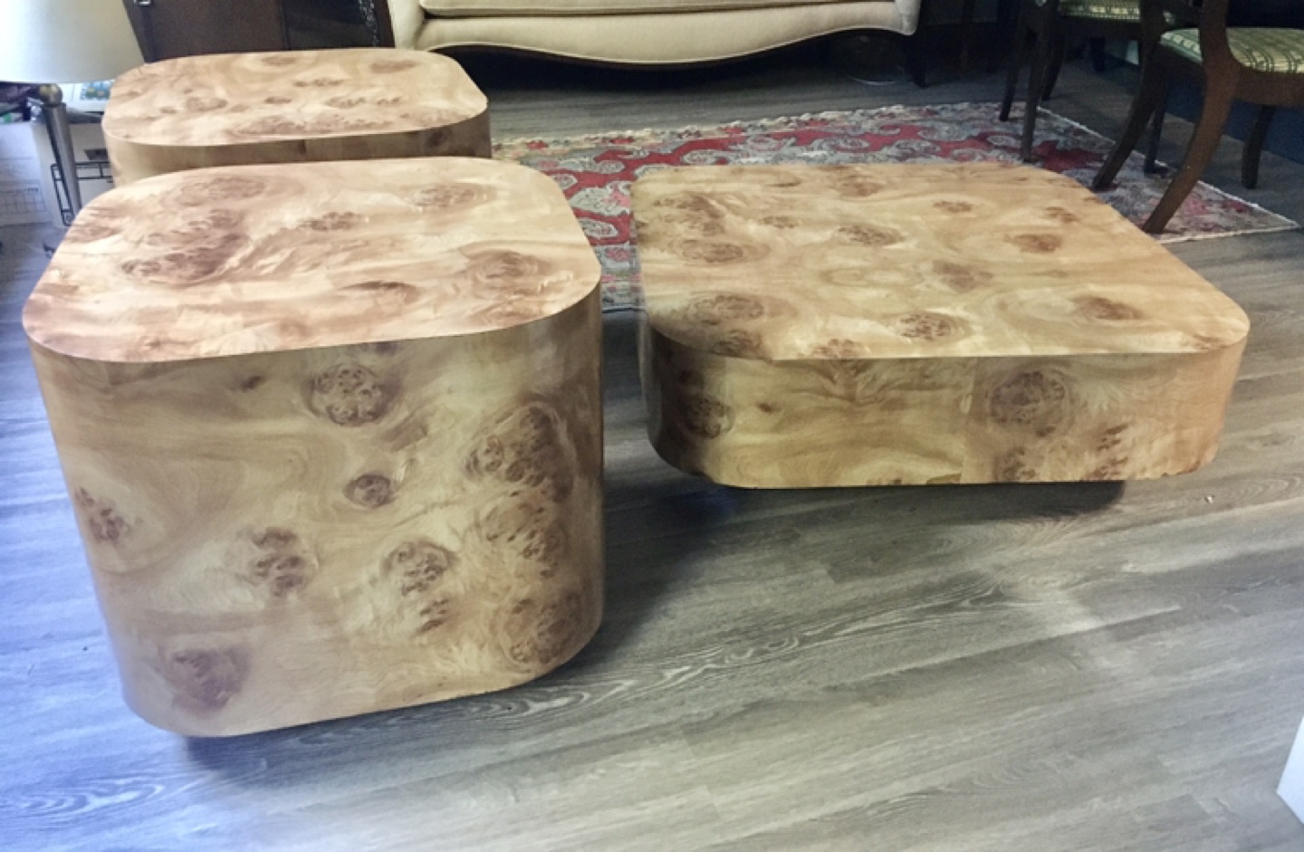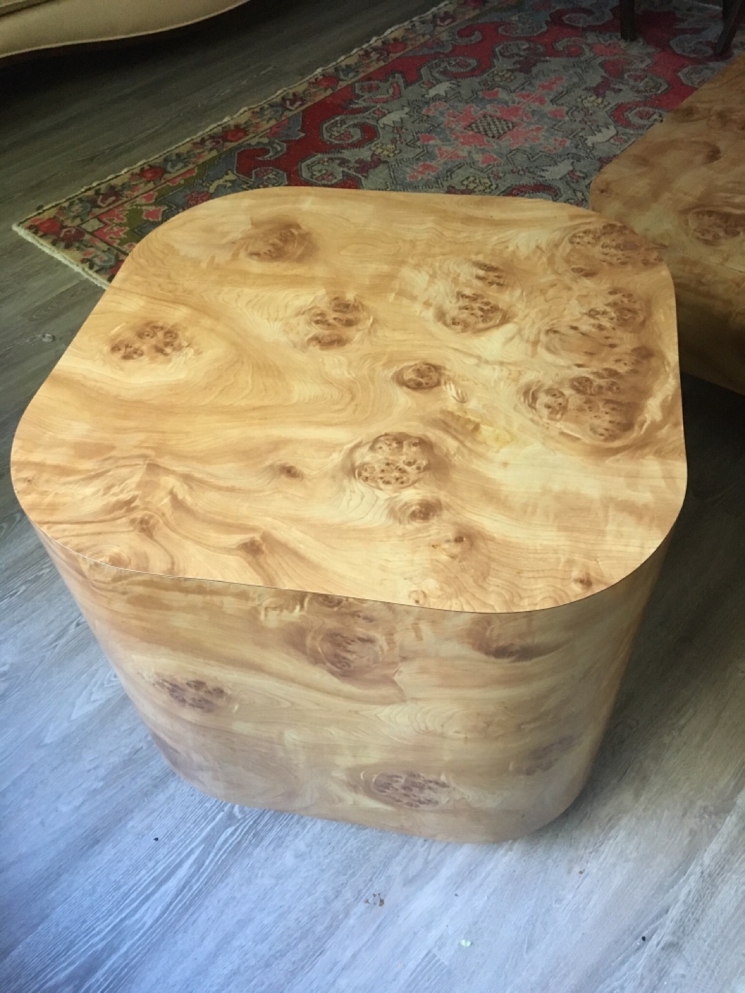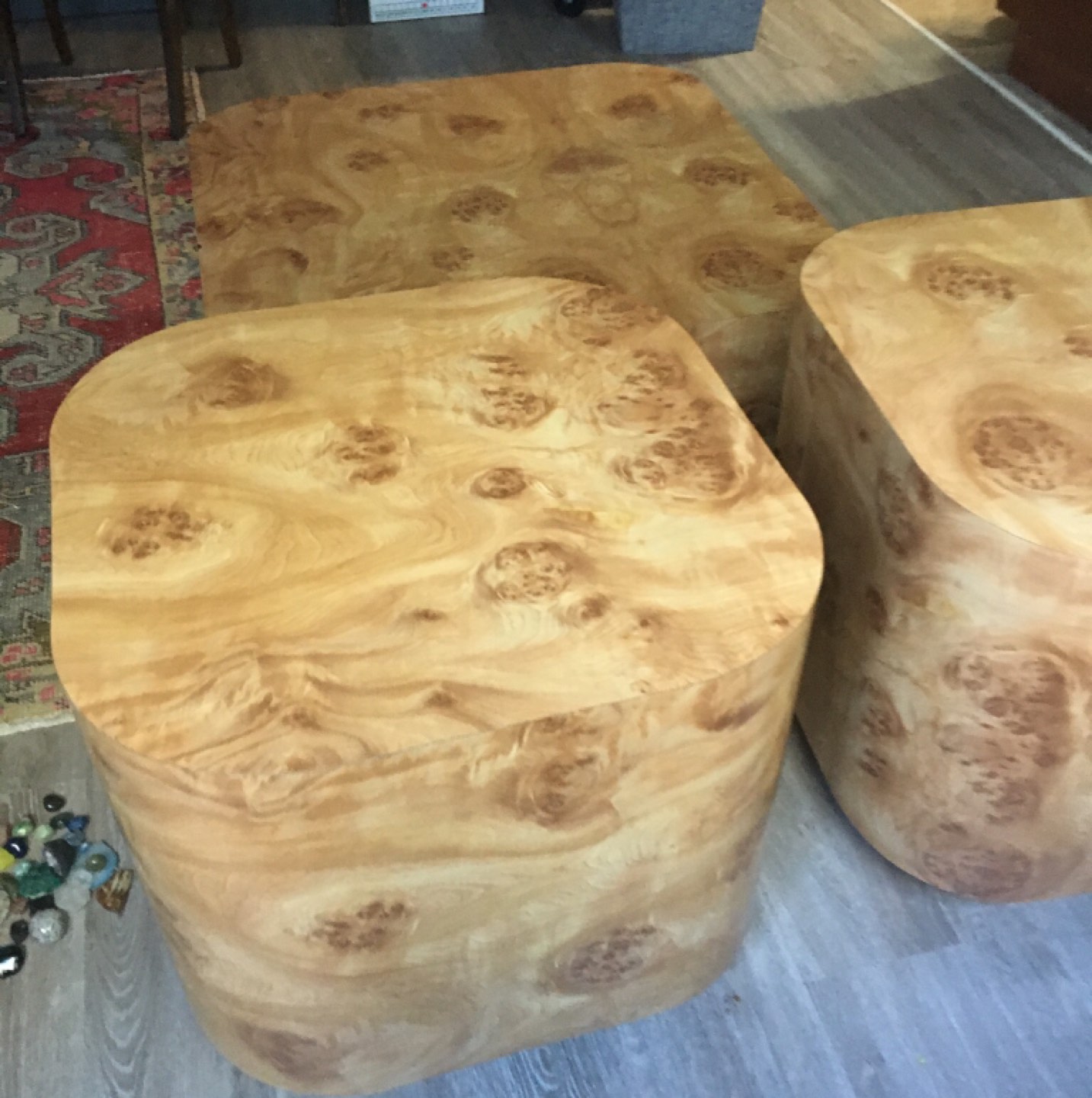 Absolutely one of a kind faux wood Formica set. Round edges makes it family friendly. One coffee table and two end tables. Sad to see this unique set go but downsizing.