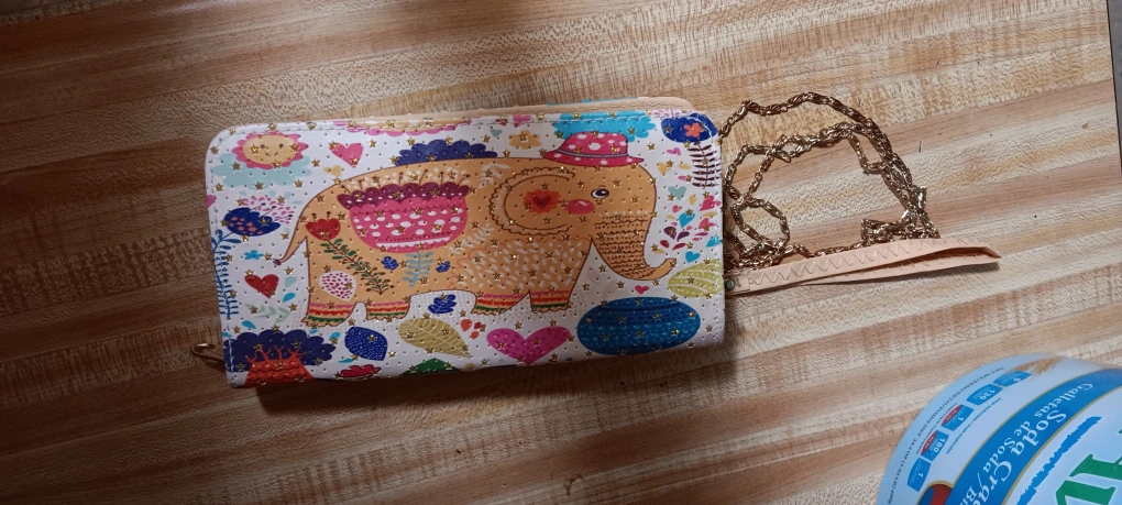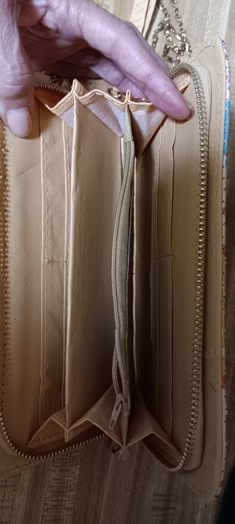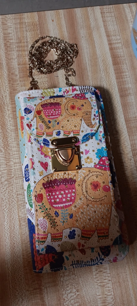 Beautiful colors are in this clutch. with several pockets for I'd a d credit card holder. Comes with a long chain. Very elegant and sparkles.
