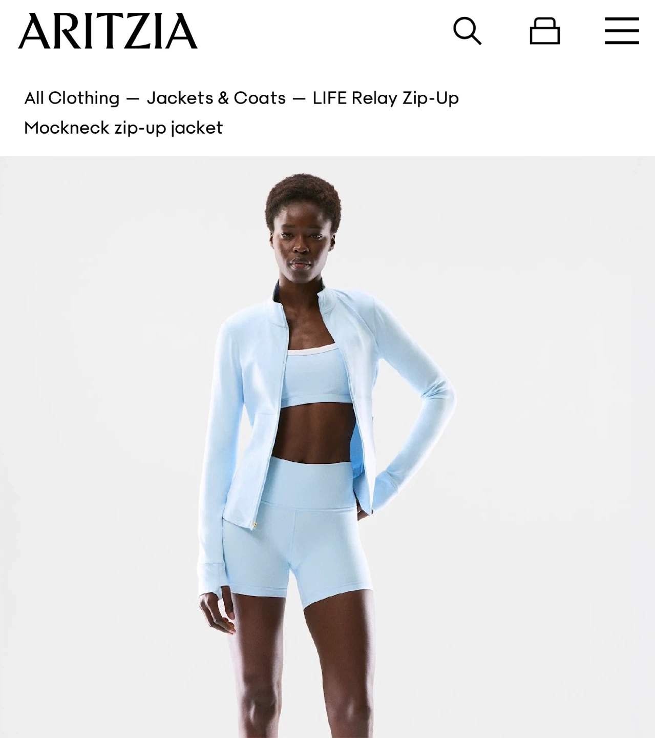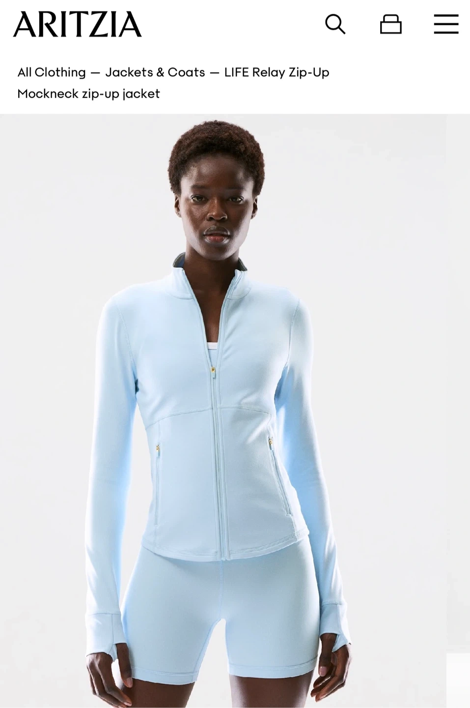 This is an Aritzia LIFE Relay Zip-Up jacket. It's a light blue mockneck style with a full zip front. Features zippered pockets and a comfortable fit.