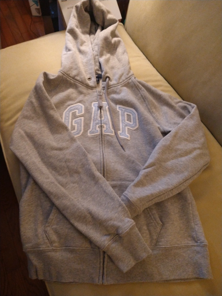 Ladies grey GAP hoodie is 77% cotton, and 33% polyester.