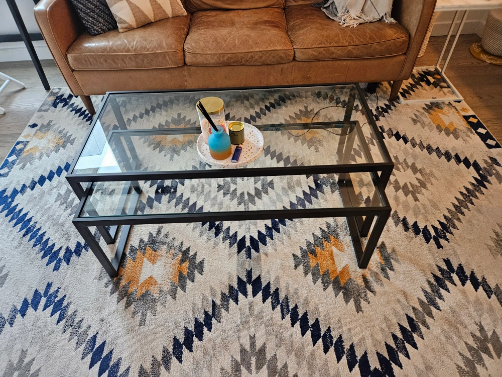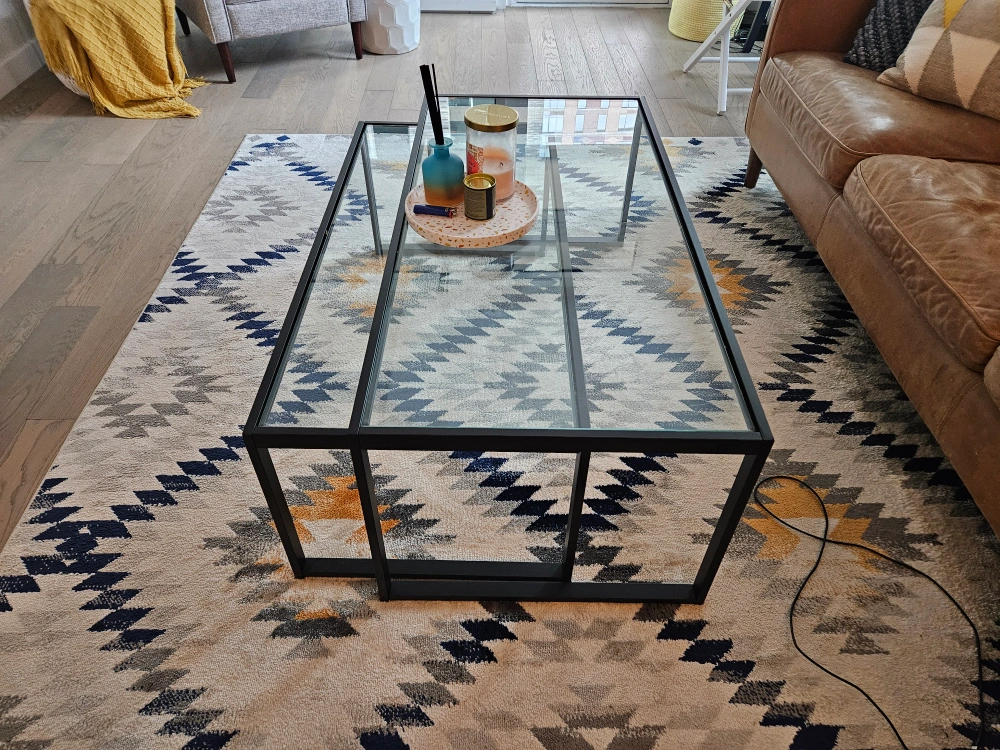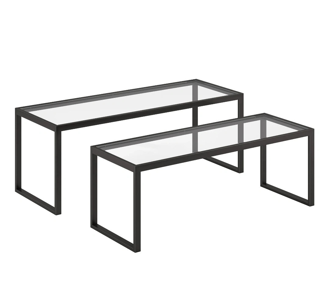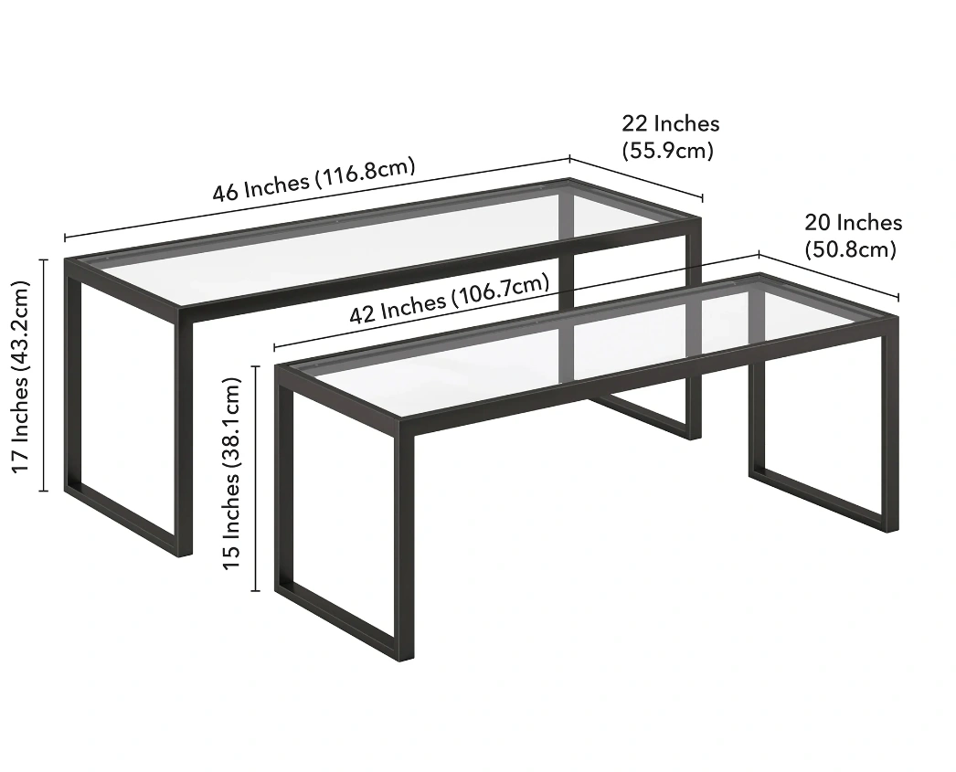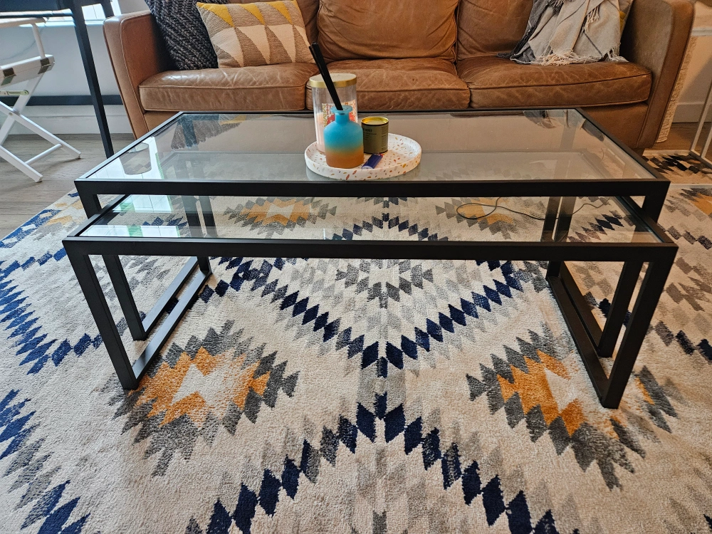 Designed to nest as a full-sized coffee table, these tables have the ability to completely separate, creating versatile pieces to use throughout the living room. The tone of the rectangle frame elevates the design along with the glass top.