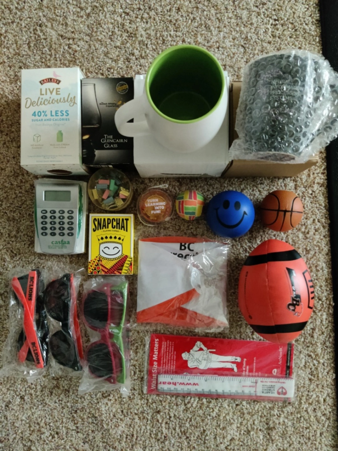 Mugs, glass cups, toys, balls, yoyo, play cards, binder clips, calculator, sunglasses. Pick whatever you want.