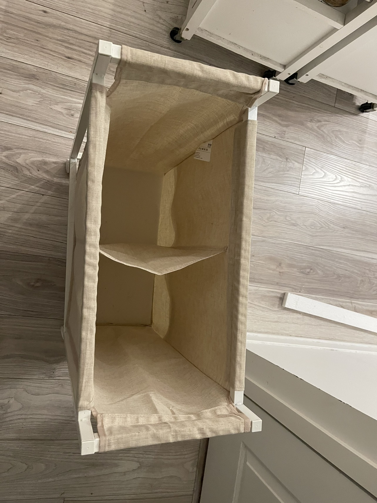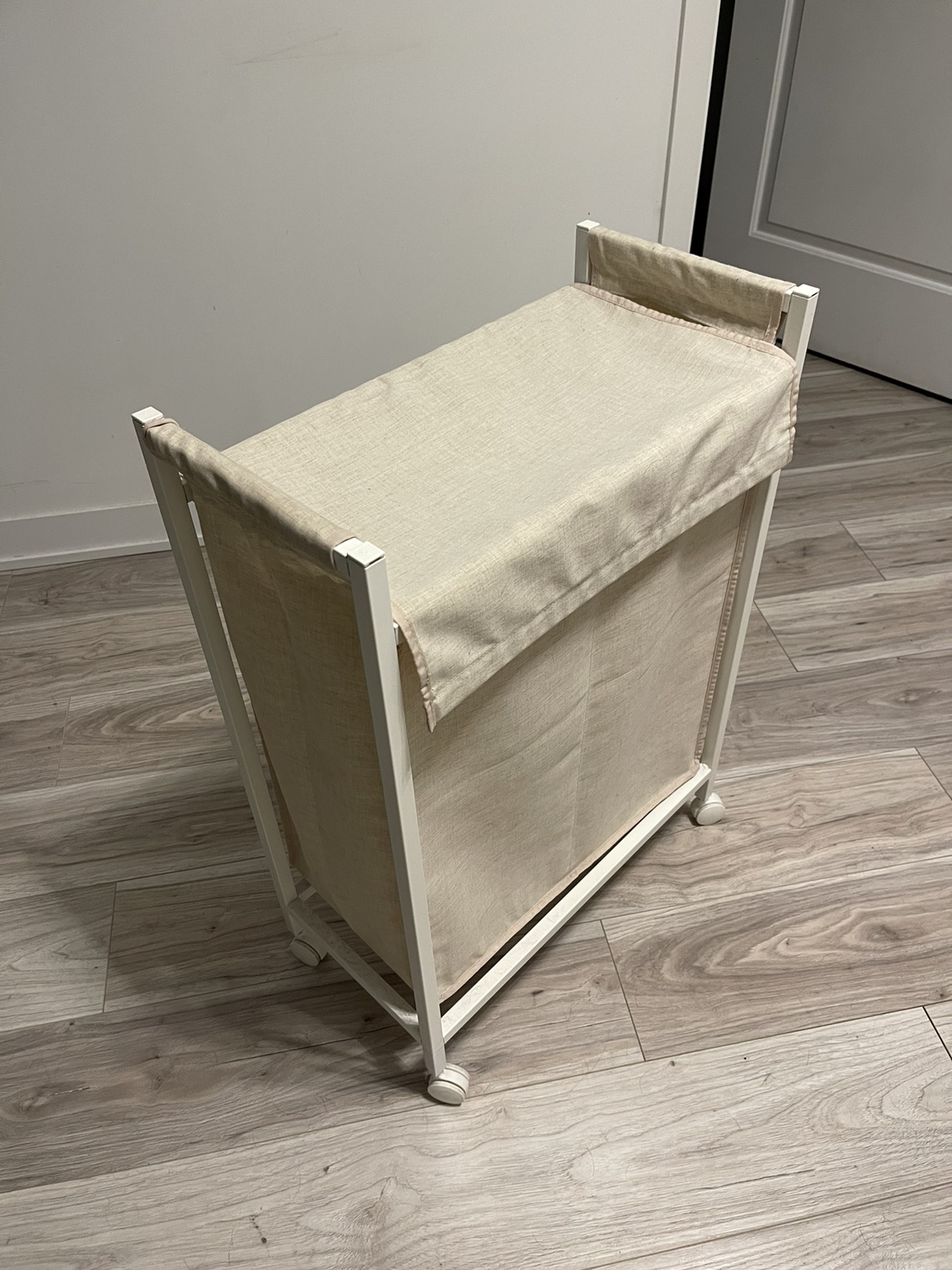 Removable and washable laundry basket, rarely used in the guest bathroom, perfect condition, no stains or marks. On wheels so easy to move around. Beige and white
