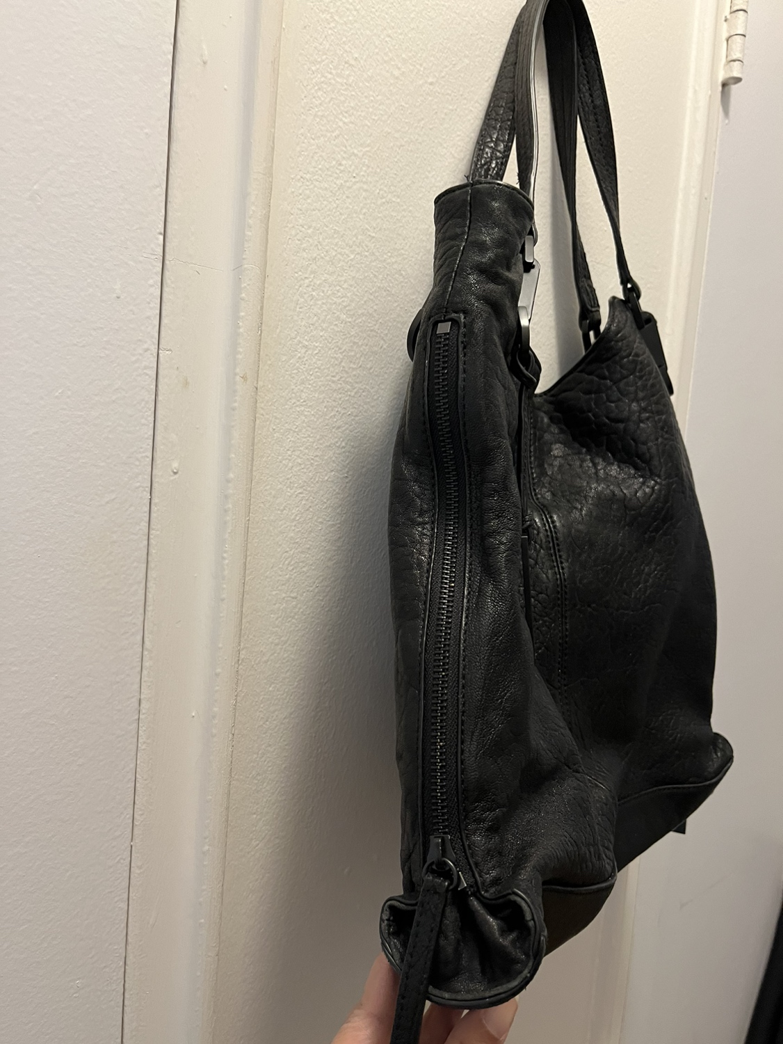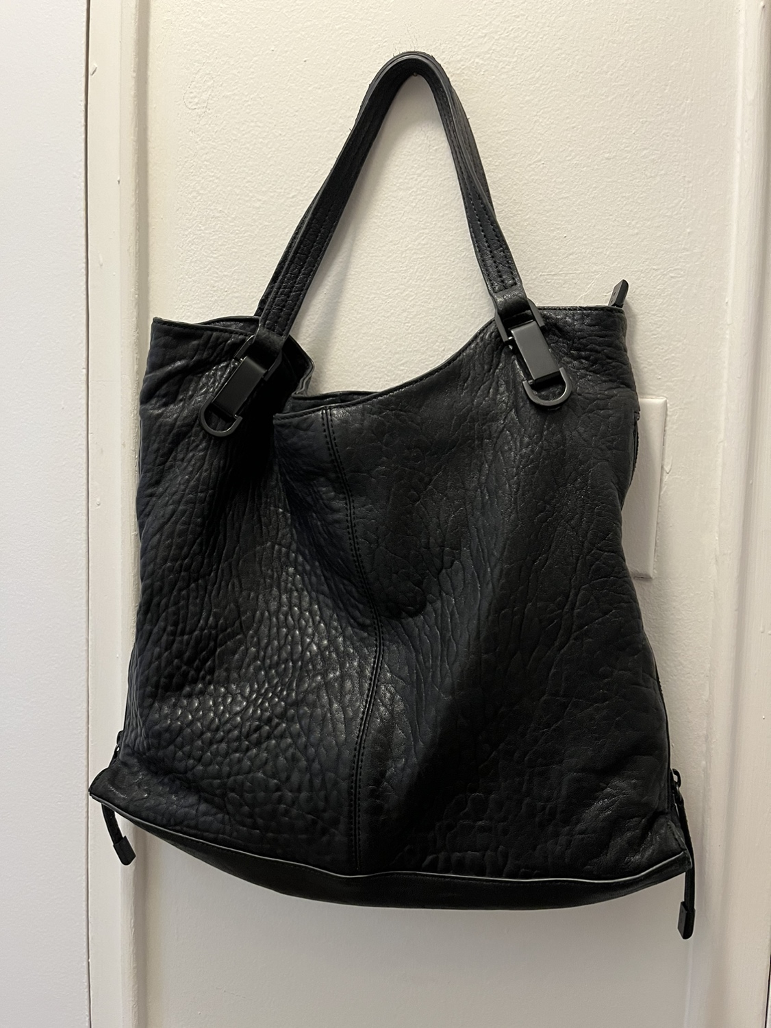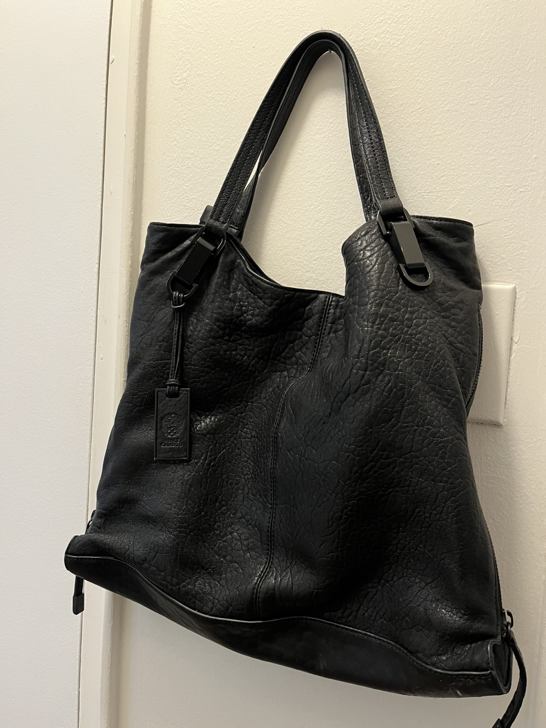 Black leather tote. Top and side zippers. Excellent condition.