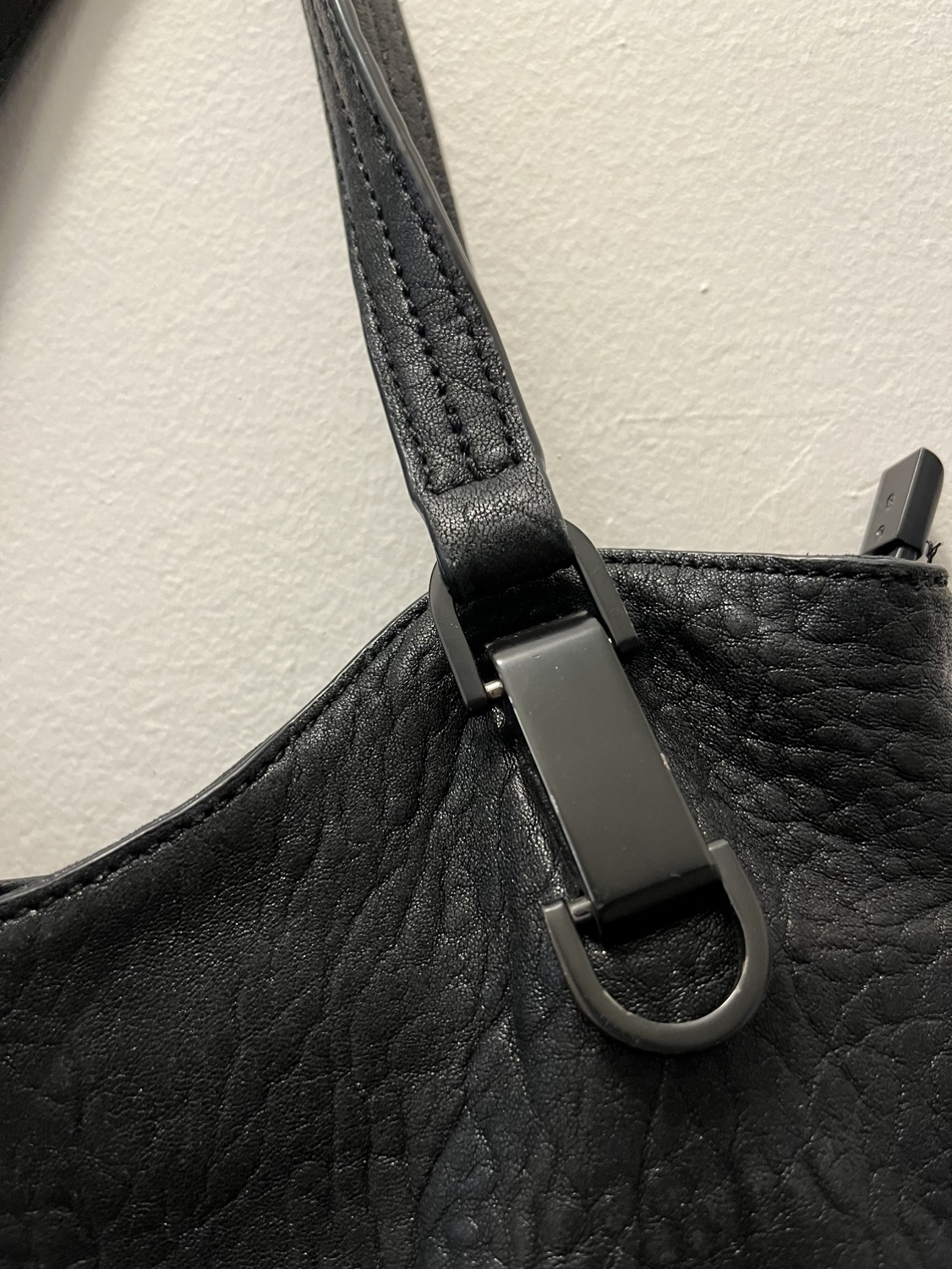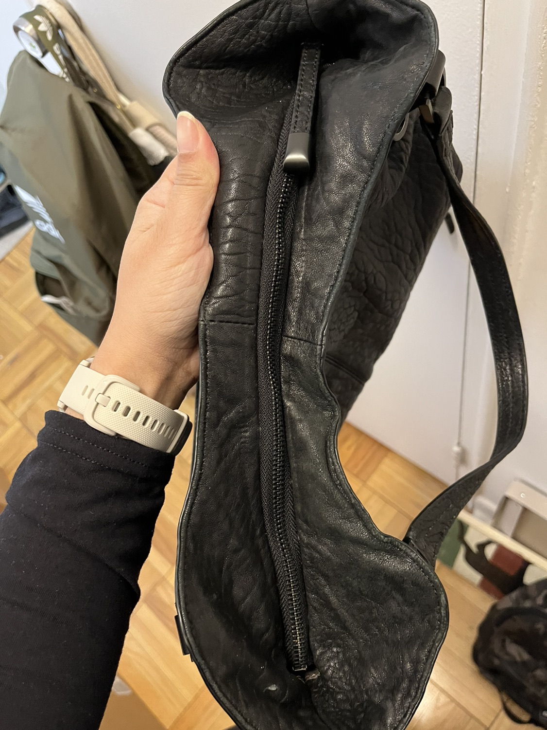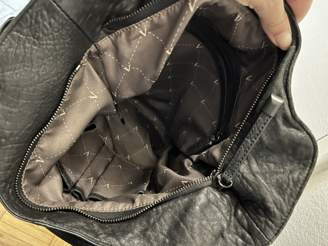 Black leather tote. Top and side zippers. Excellent condition.