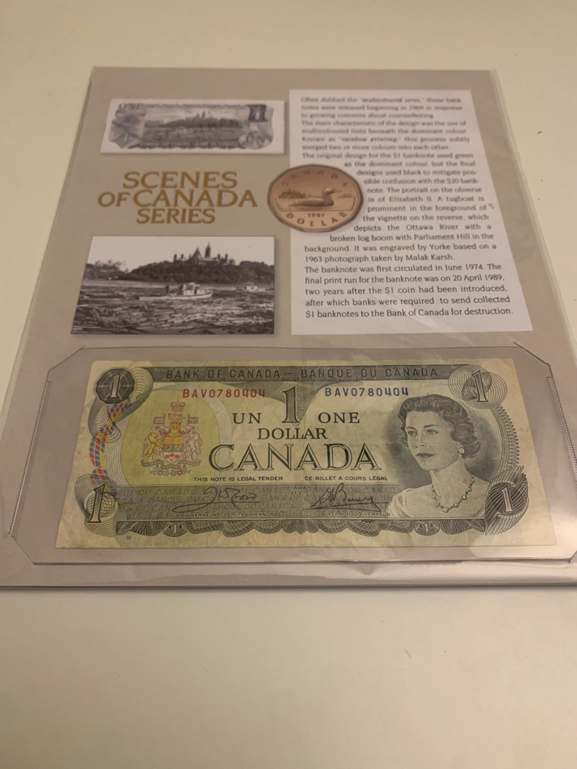 A MINT condition Canadian $1 bill, dated 1973. This bill is inserted in a semi-tough plastic bill holder and slotted into a beautifully designed glicee poster with information describing the process for how this bill came about. Perfect gift for a collector or even a history buff-or just those whose love it!