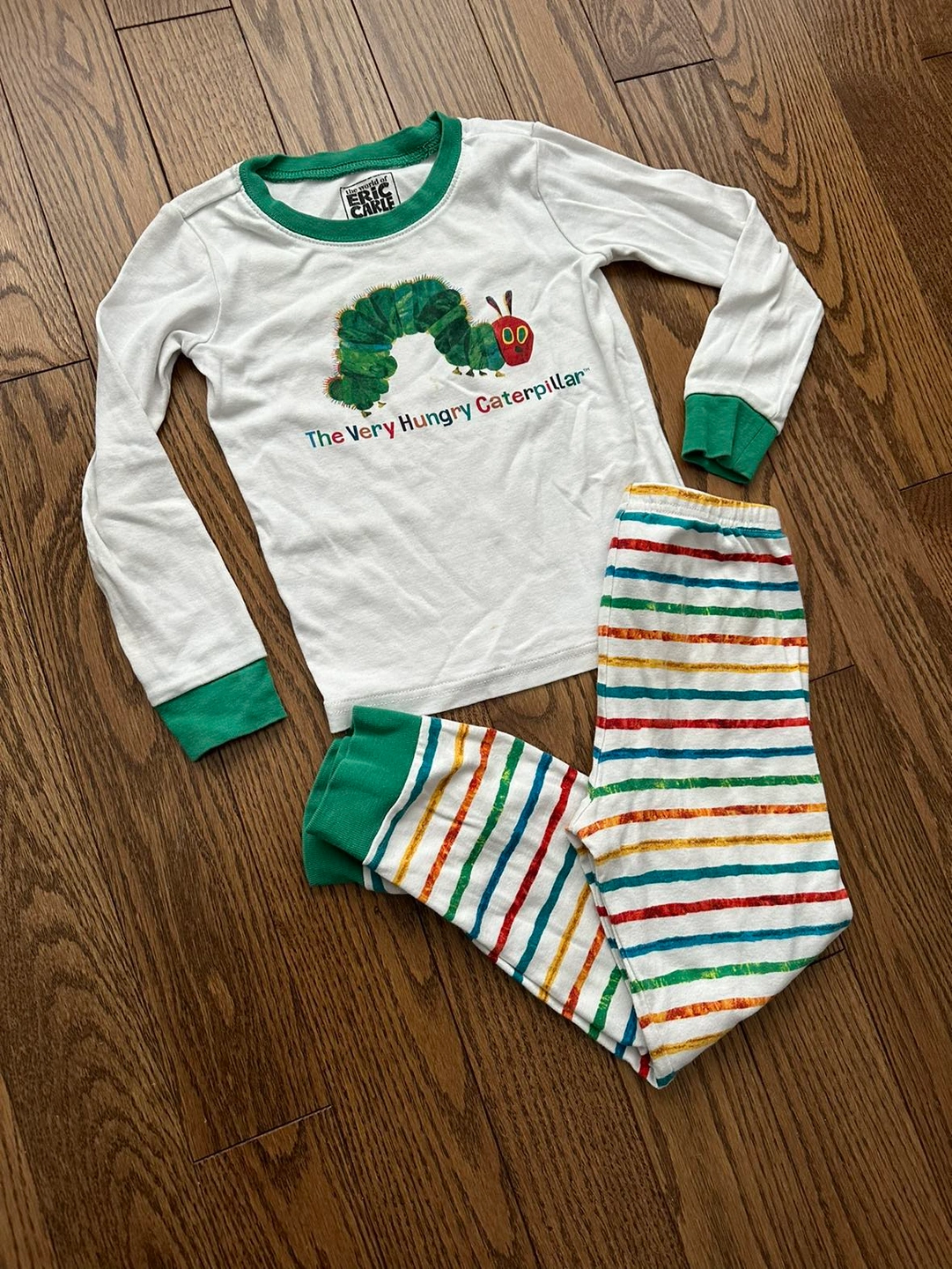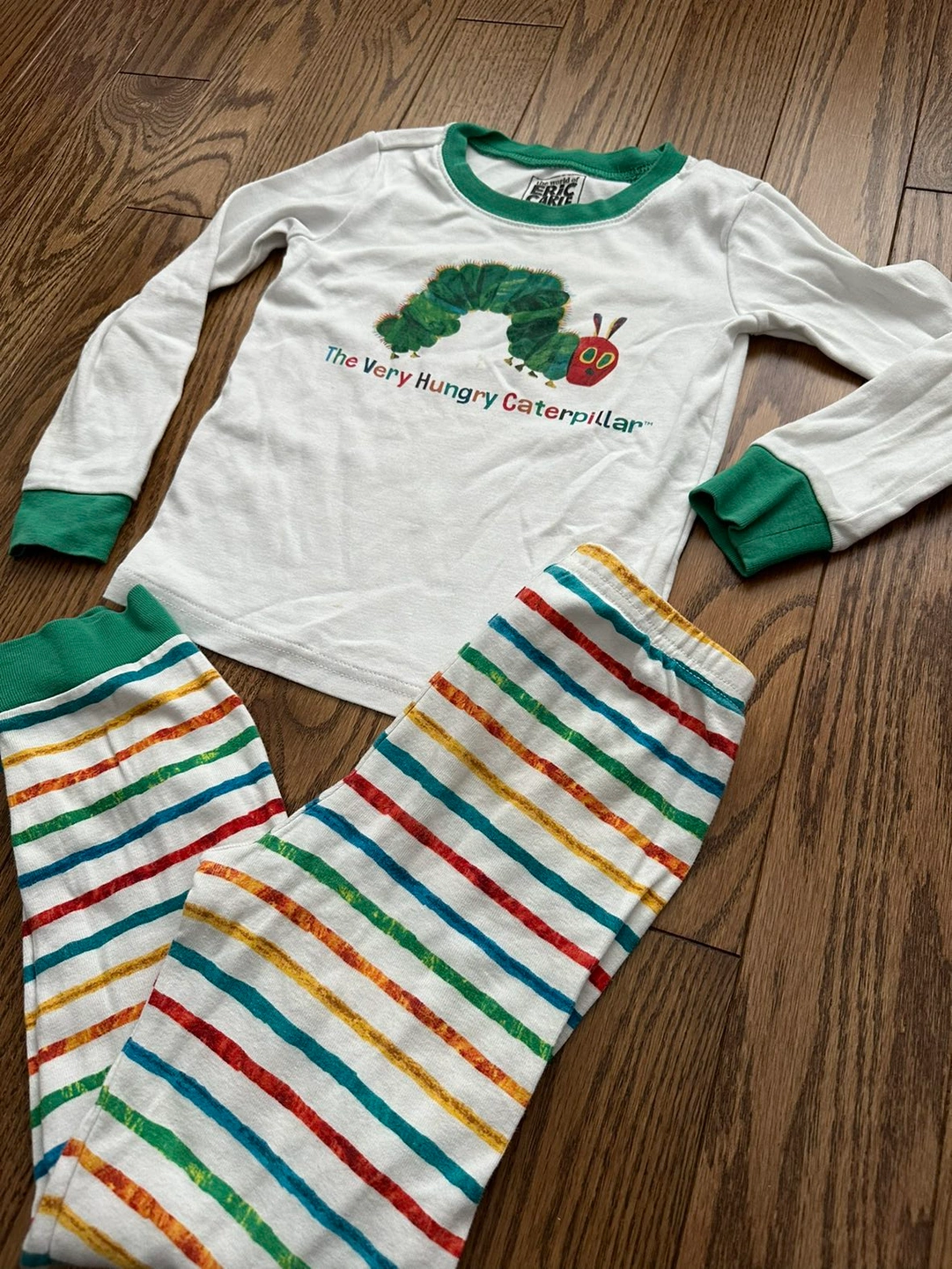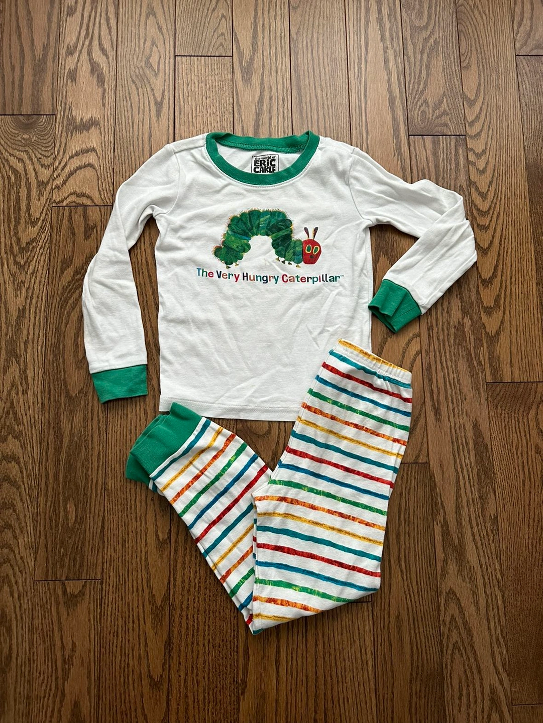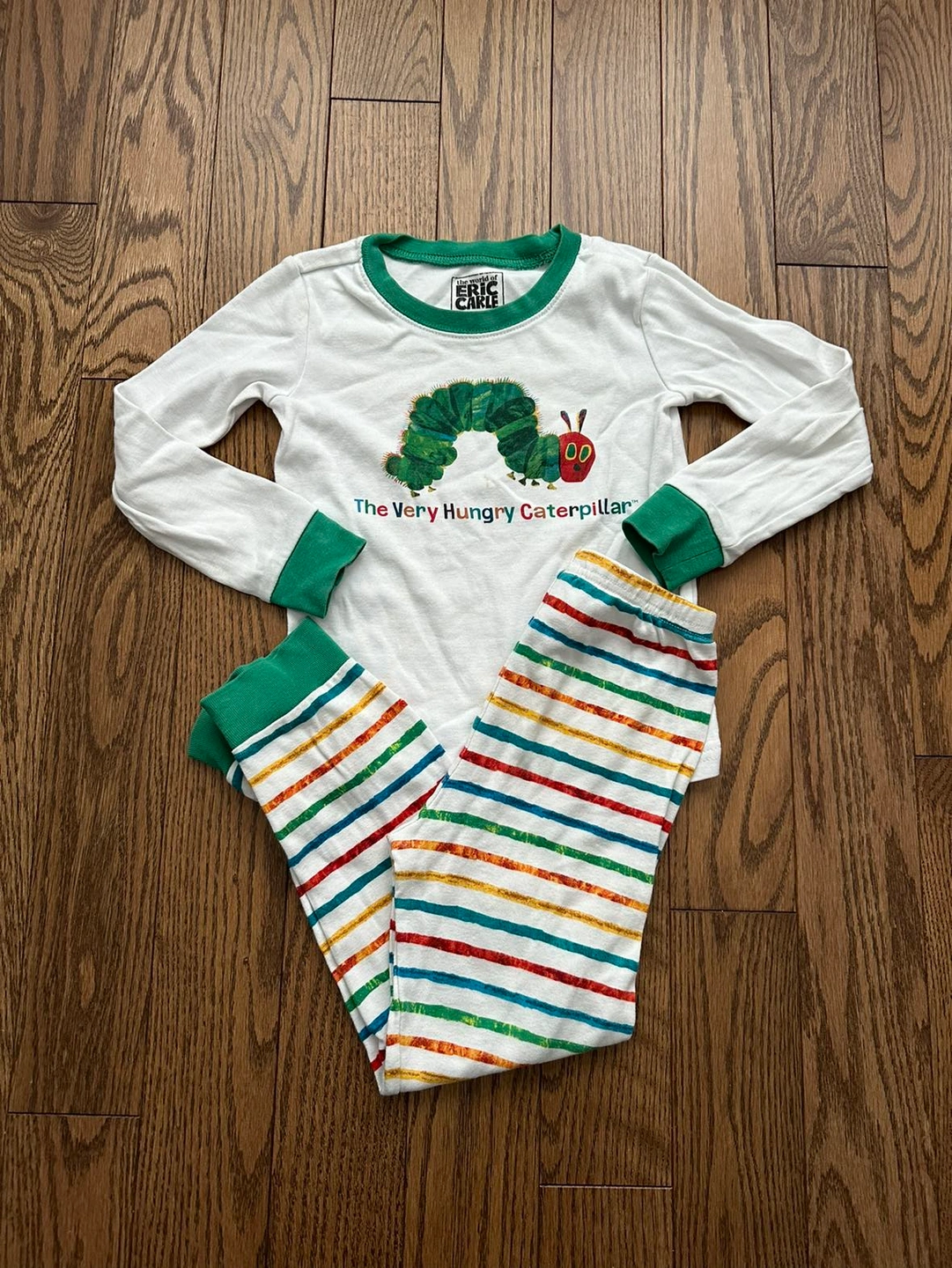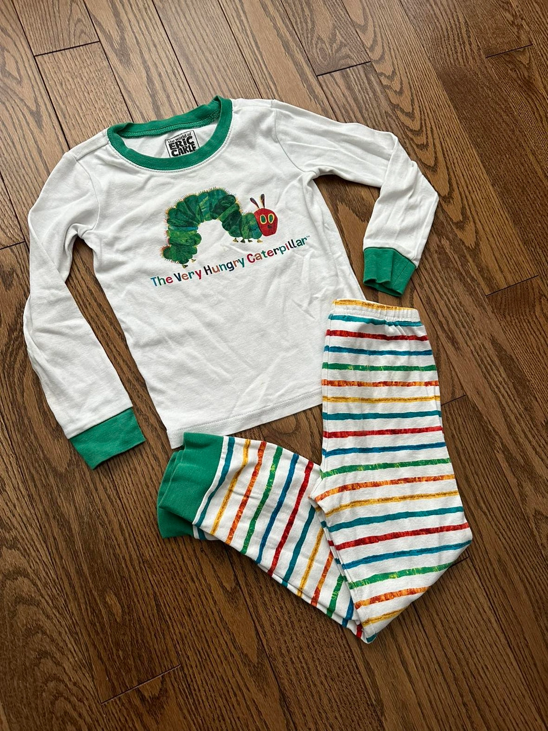 Size 6 kids Eric Carle pjs from Gymboree featuring the Hungry Caterpillar. Very adorable and cute for your tiny reader!! Good condition.