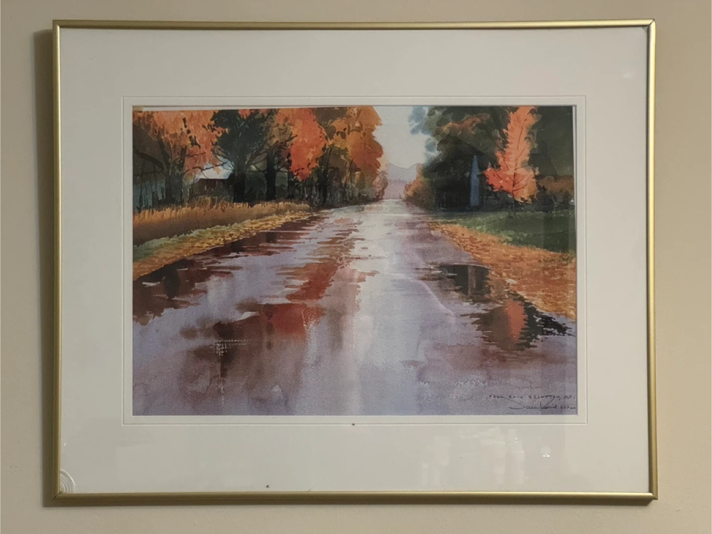 This framed watercolour depicts a scenic road during autumn, with vibrant fall foliage reflected in the wet surface. It's beautifully matted and framed, ready to hang. This piece would add a touch of nature's beauty to any room.