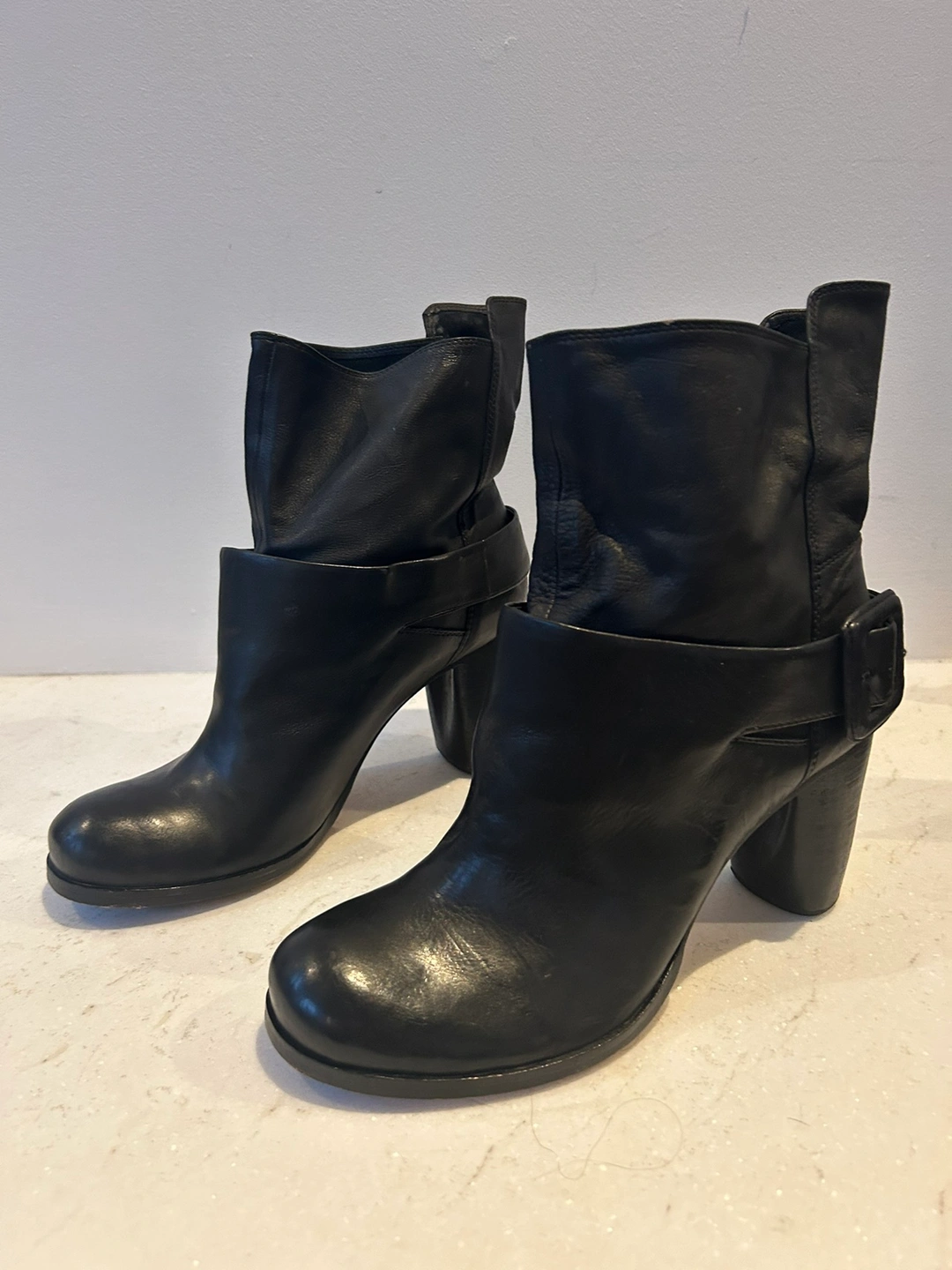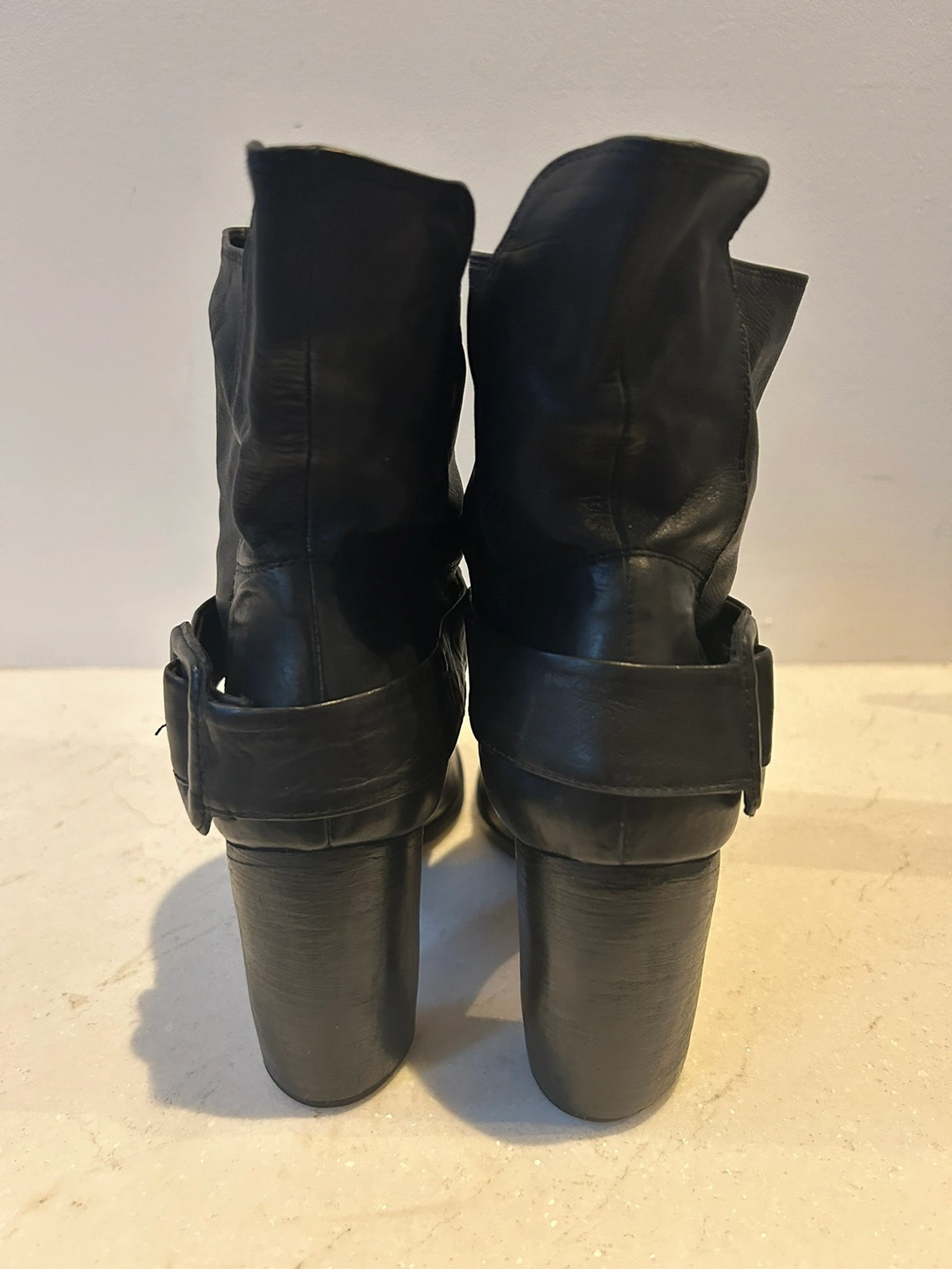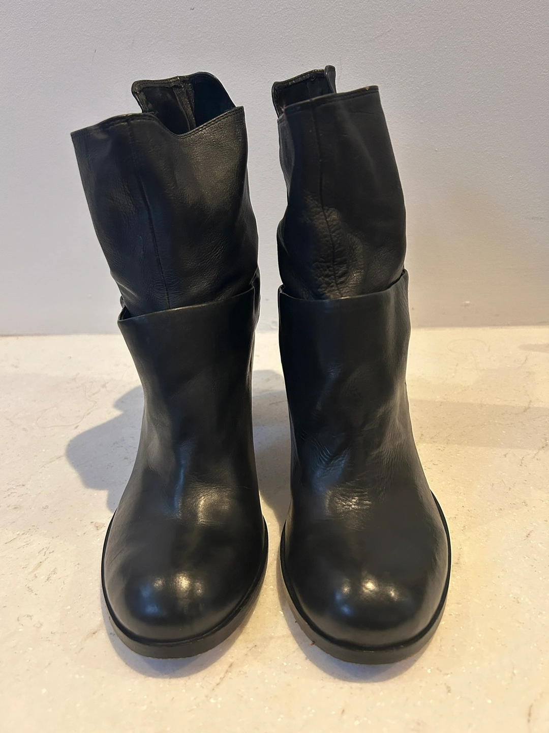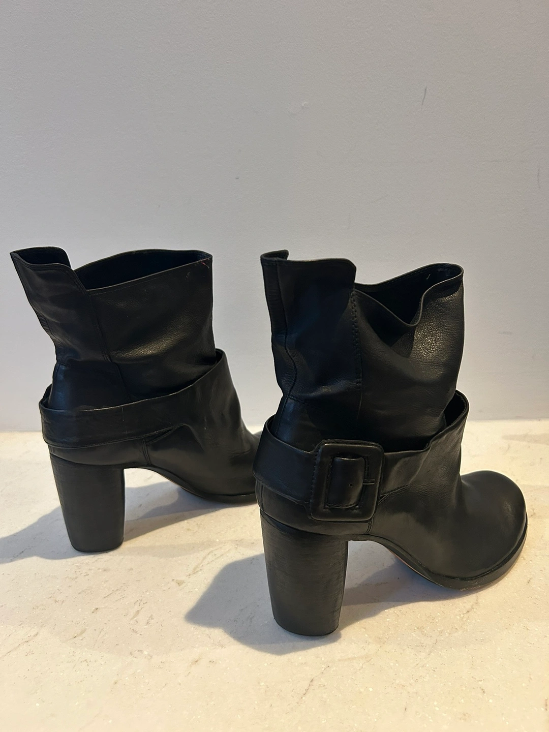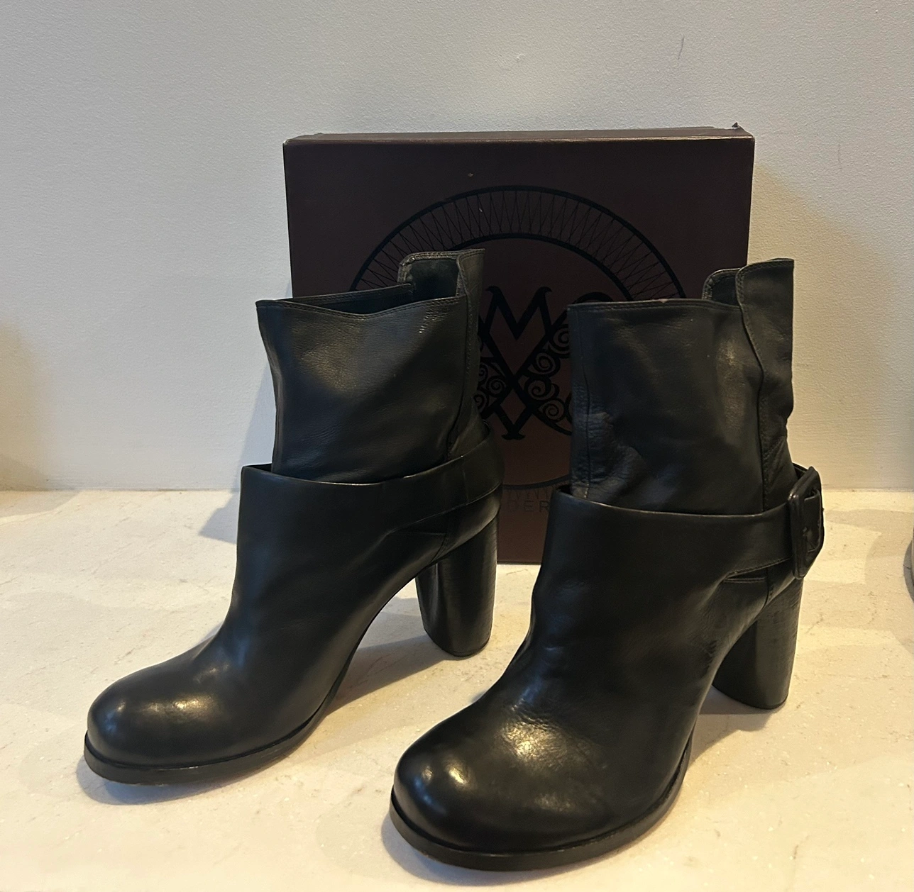 These Modern Vintage black leather boots are the perfect addition to any wardrobe. Made with high-quality suede lining and a block heel, these ankle booties are both stylish and comfortable. The boots are brand new and come in their original box.