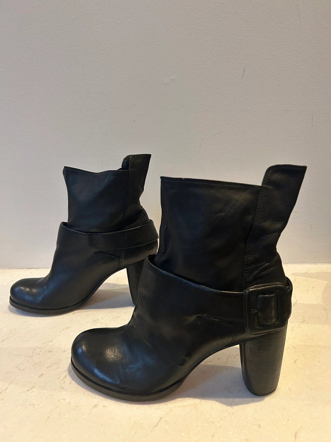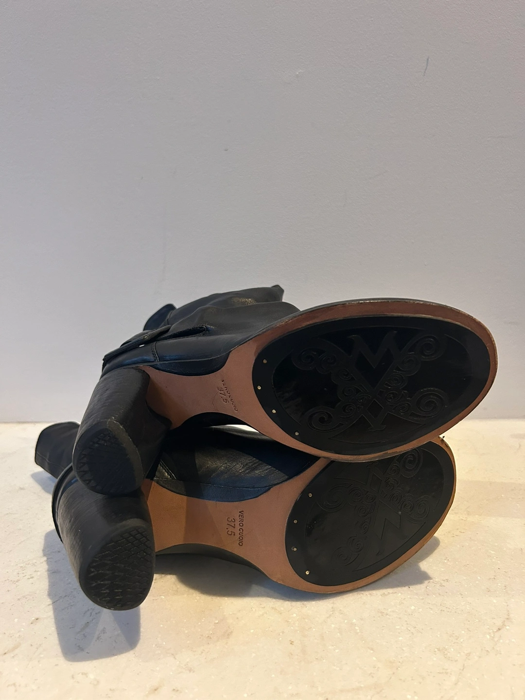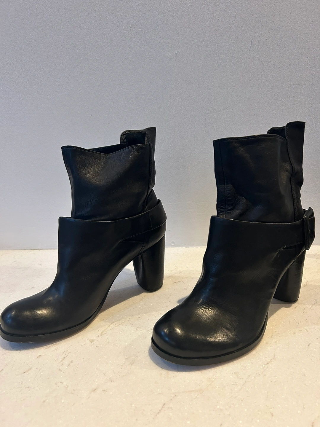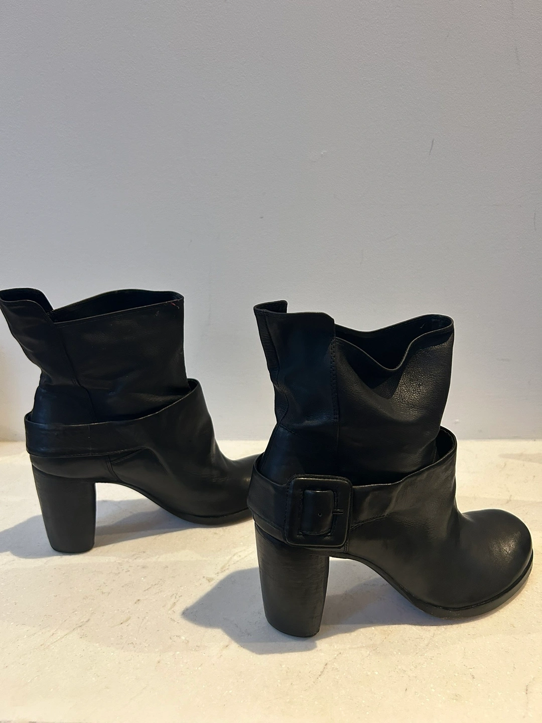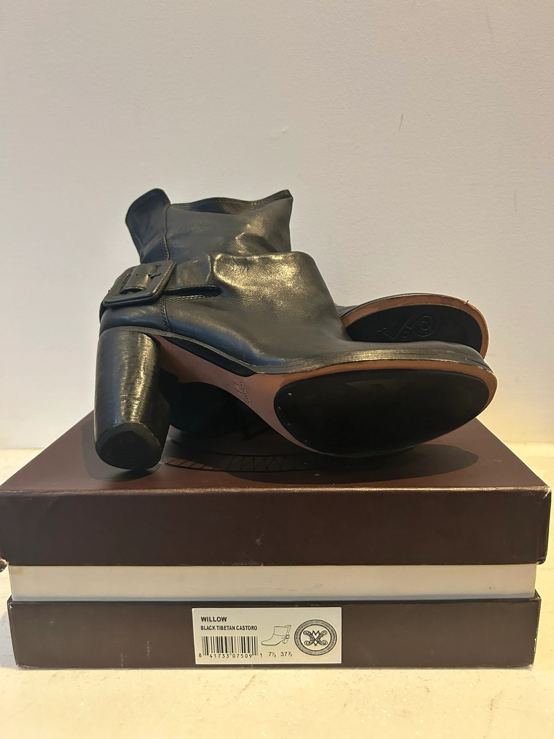 These Modern Vintage black leather boots are the perfect addition to any wardrobe. Made with high-quality suede lining and a block heel, these ankle booties are both stylish and comfortable. The boots are brand new and come in their original box.