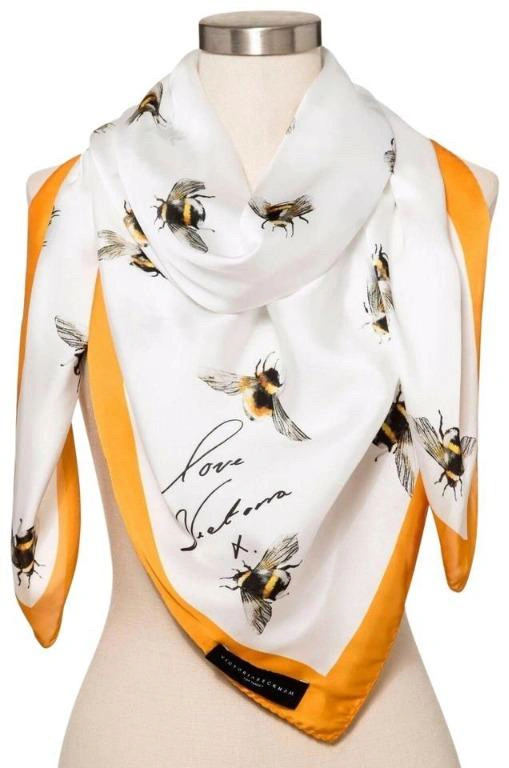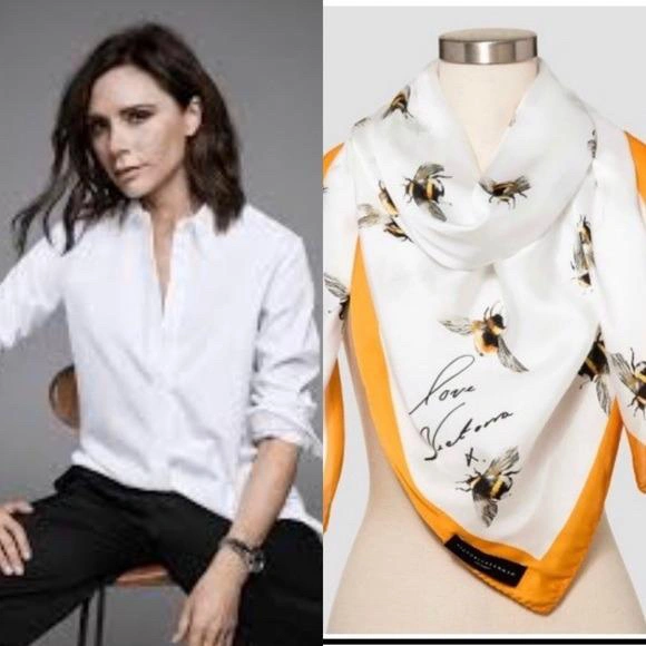 Oversized bumble bee print scarf by Victoria Beckham Collab with Target. Victoria Beckham’s signature on one corner.