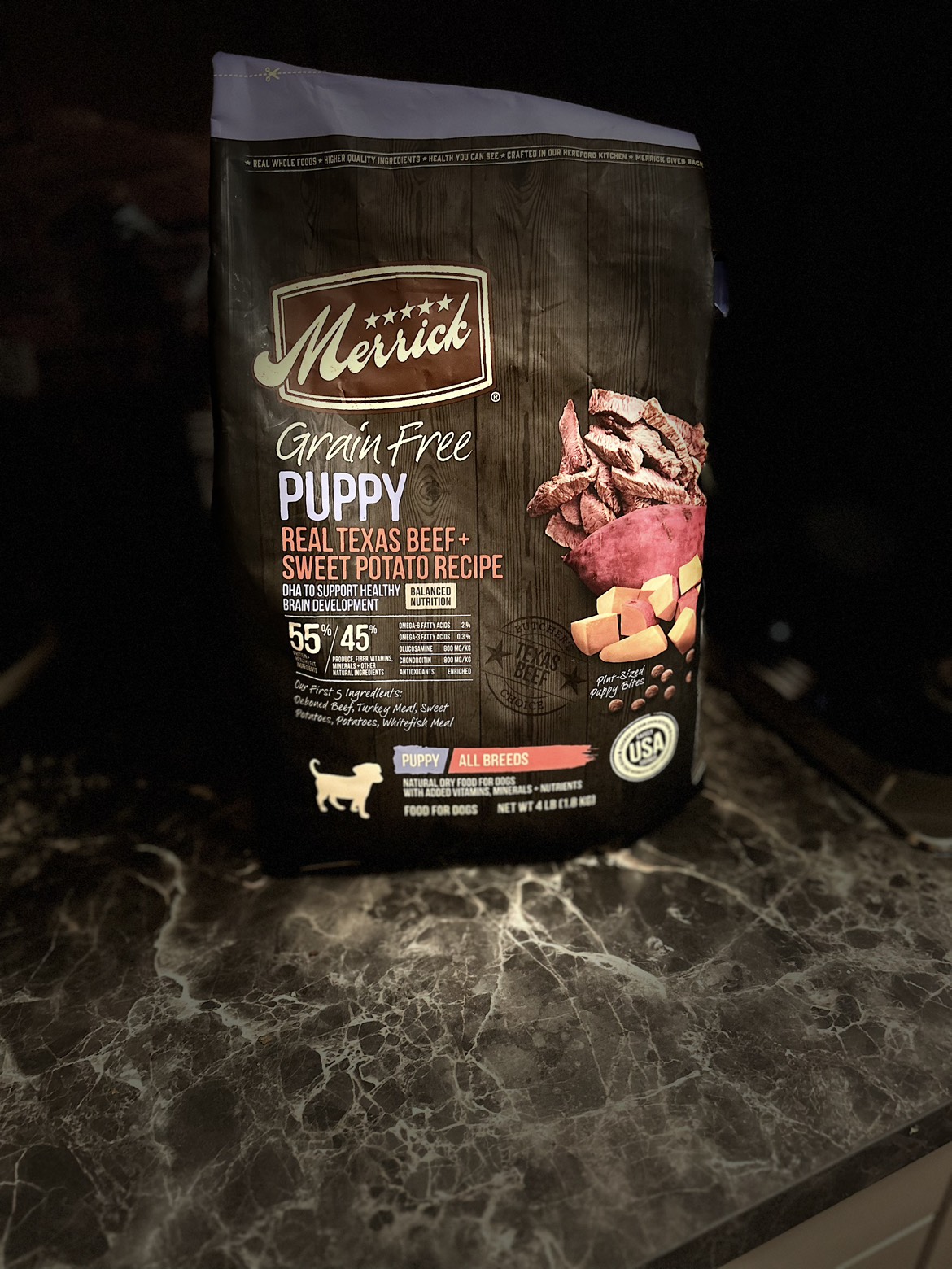 309Merrick beef and sweet potato puppy food. Mostly full, just missing a cup. My pup didn’t like it. Pick up in Parkdale