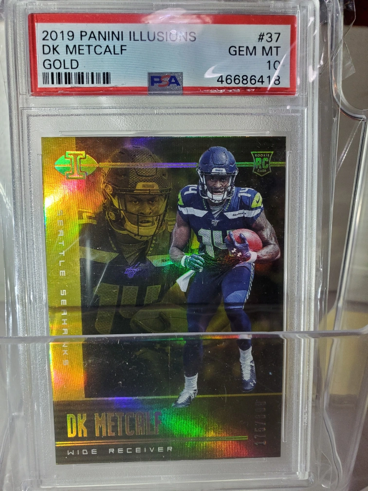 Seattle Seahawks Star wide reciever "DK Metcalf" Rookie Card (PSA 10) its #'d as well. A Rare card! Only 399 in the world printed. This card is in the highest possible grade for the top of the line grading company --> PSA