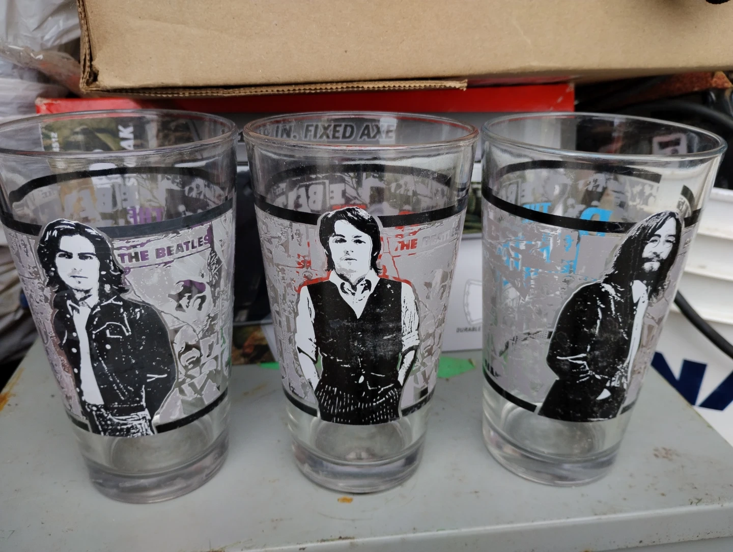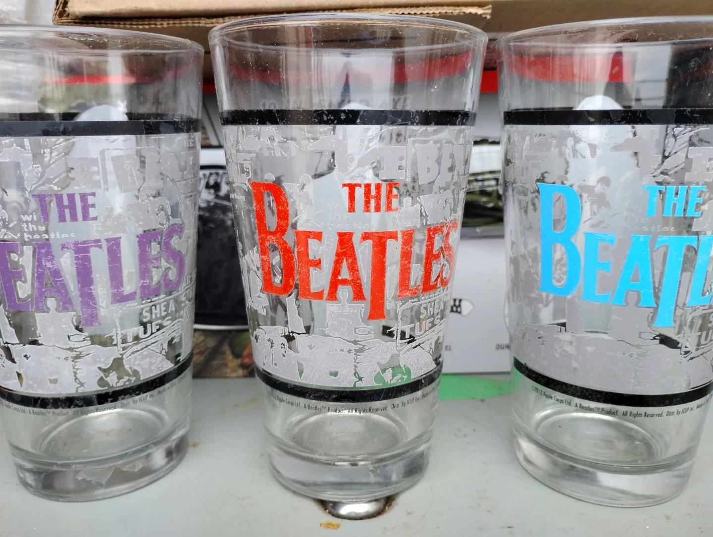 Set of three The Beatles themed drinking glasses. Features different band member portraits and colour accents. Perfect for any music fan's collection!