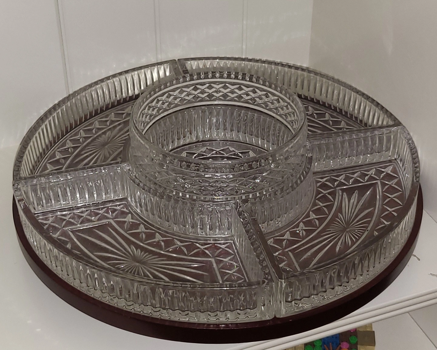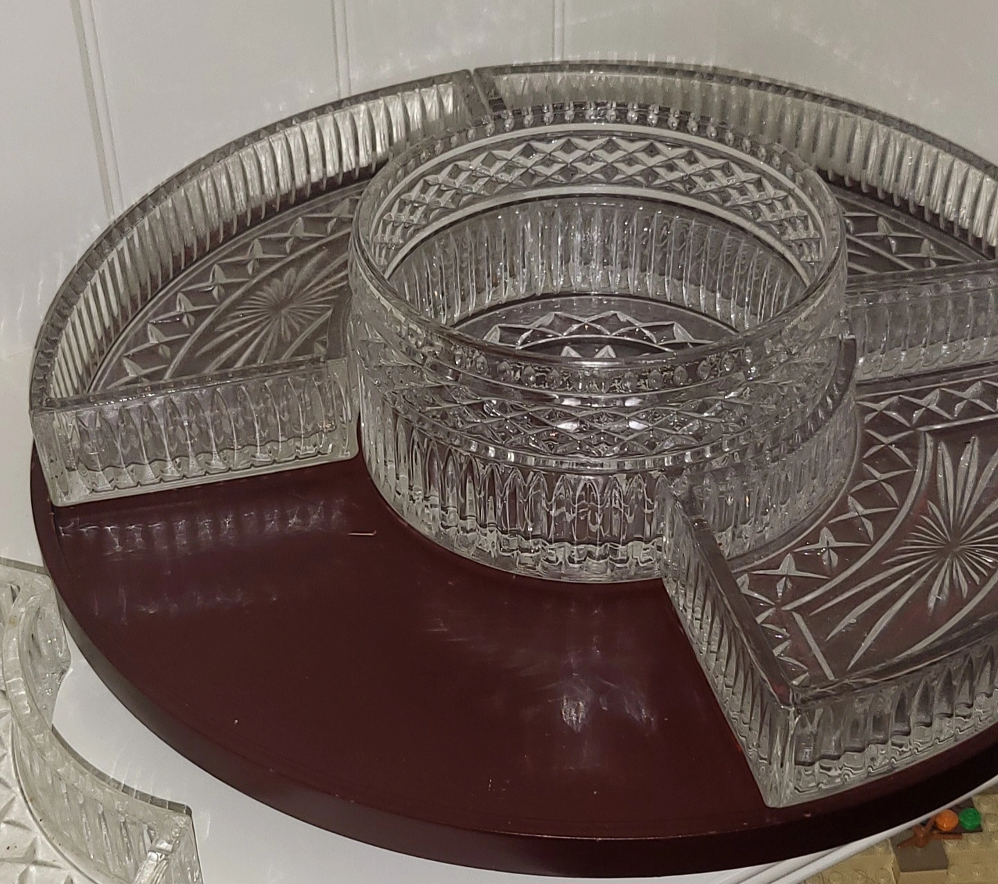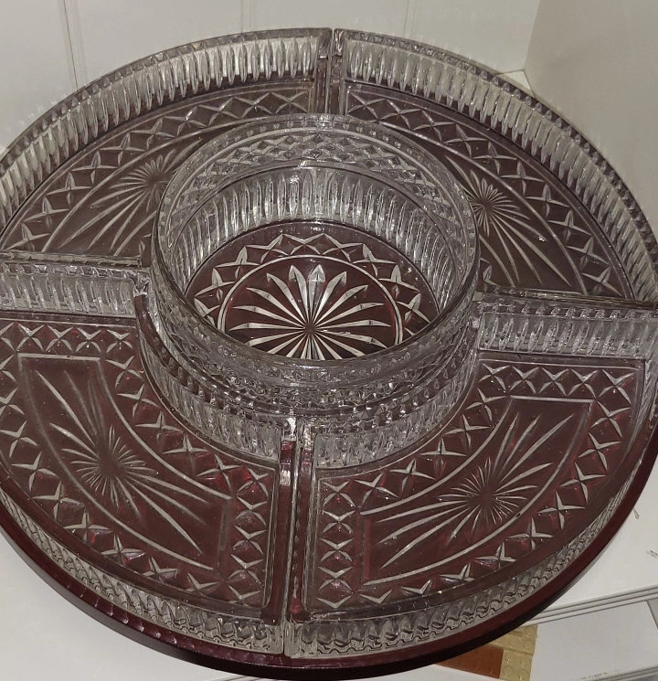Crystal snack trays on a lazy Suzan