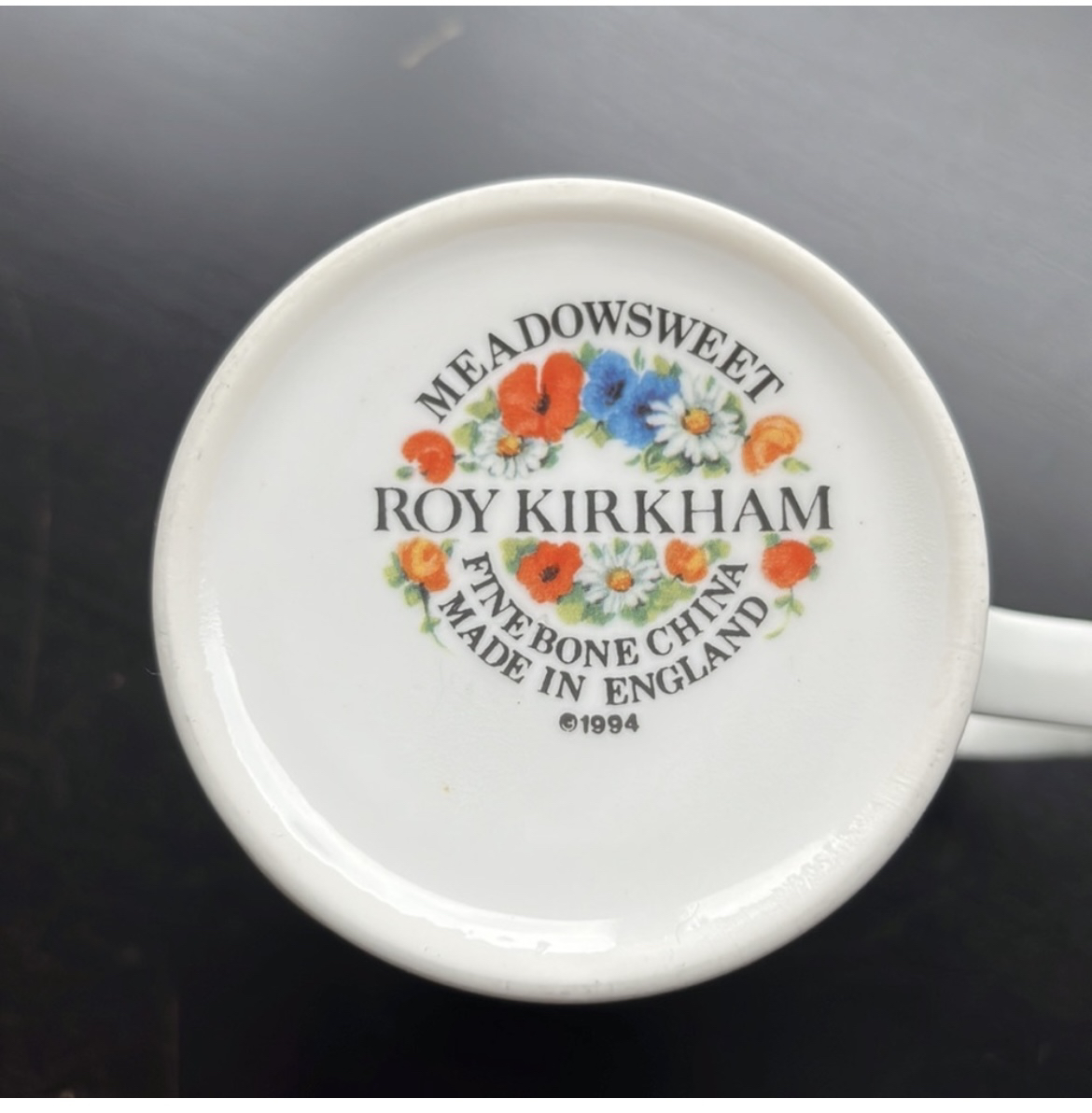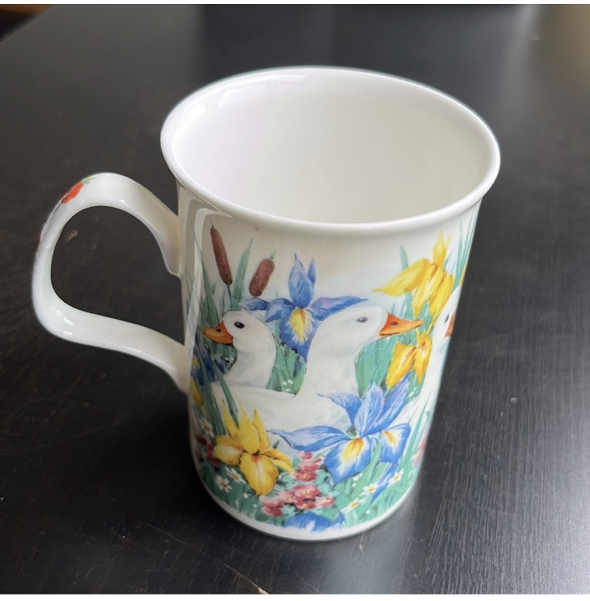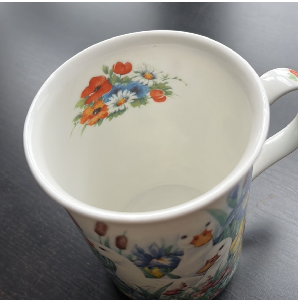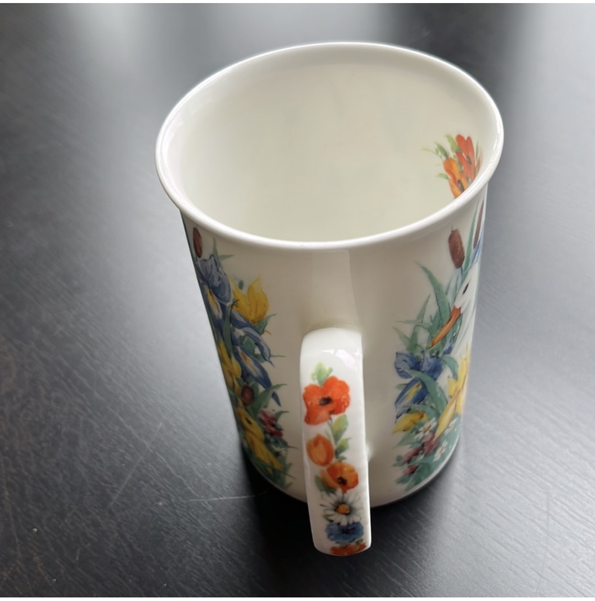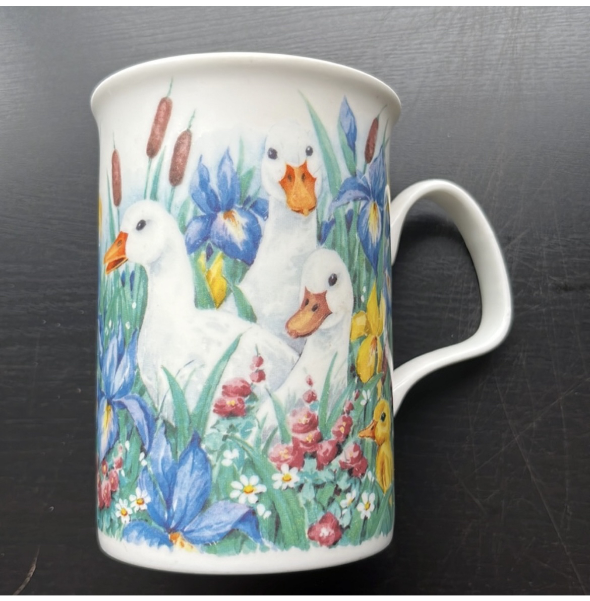Fine bone china. Made in England coffee/tea cup. Meadowsweet beautifully painted with ducks and flowers. Dated 1994.