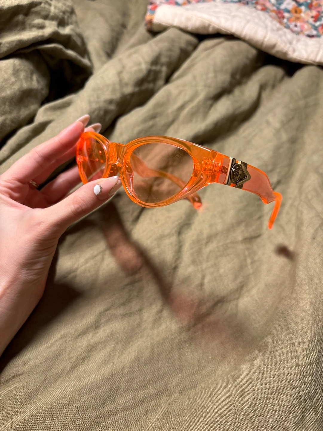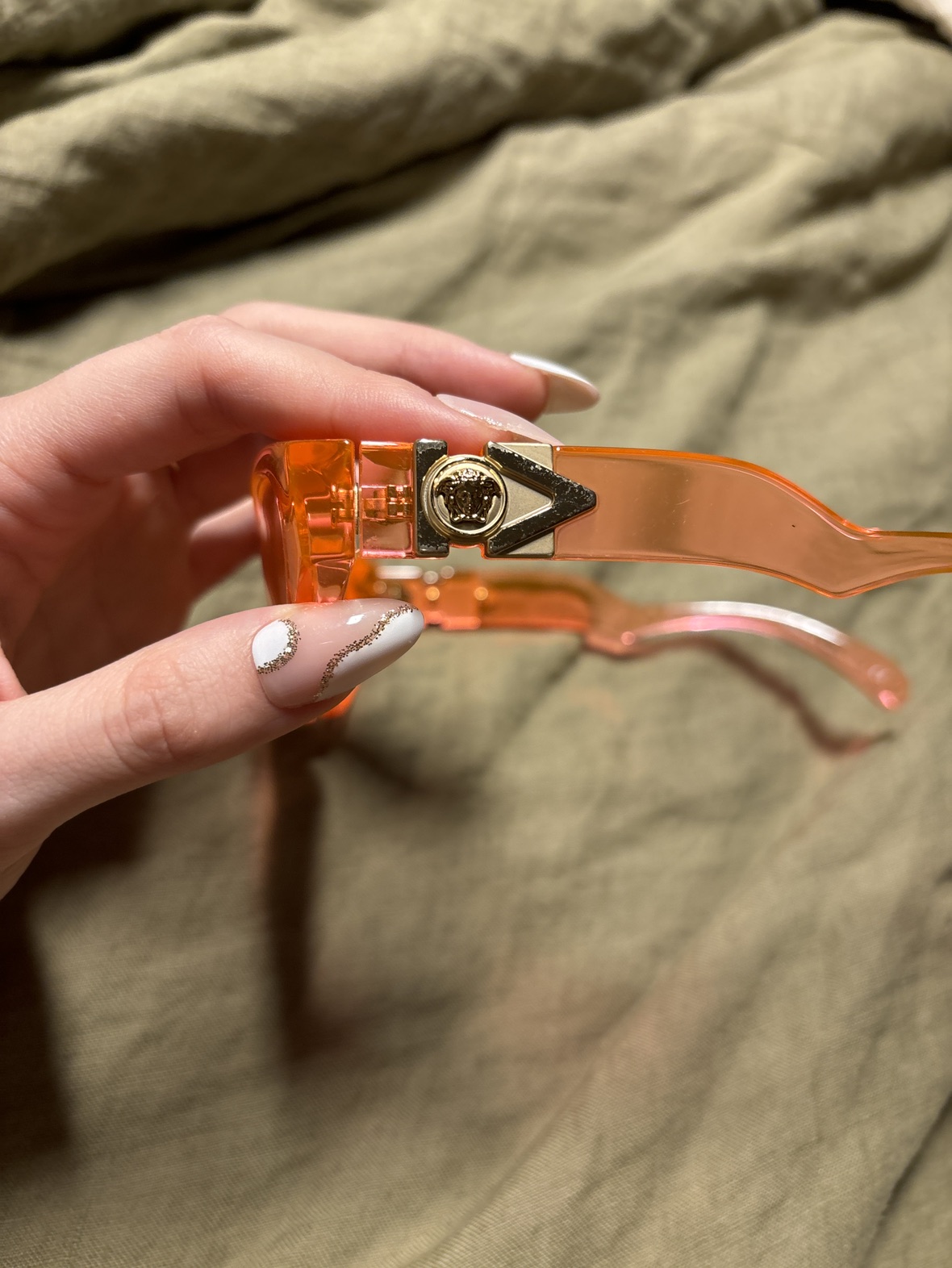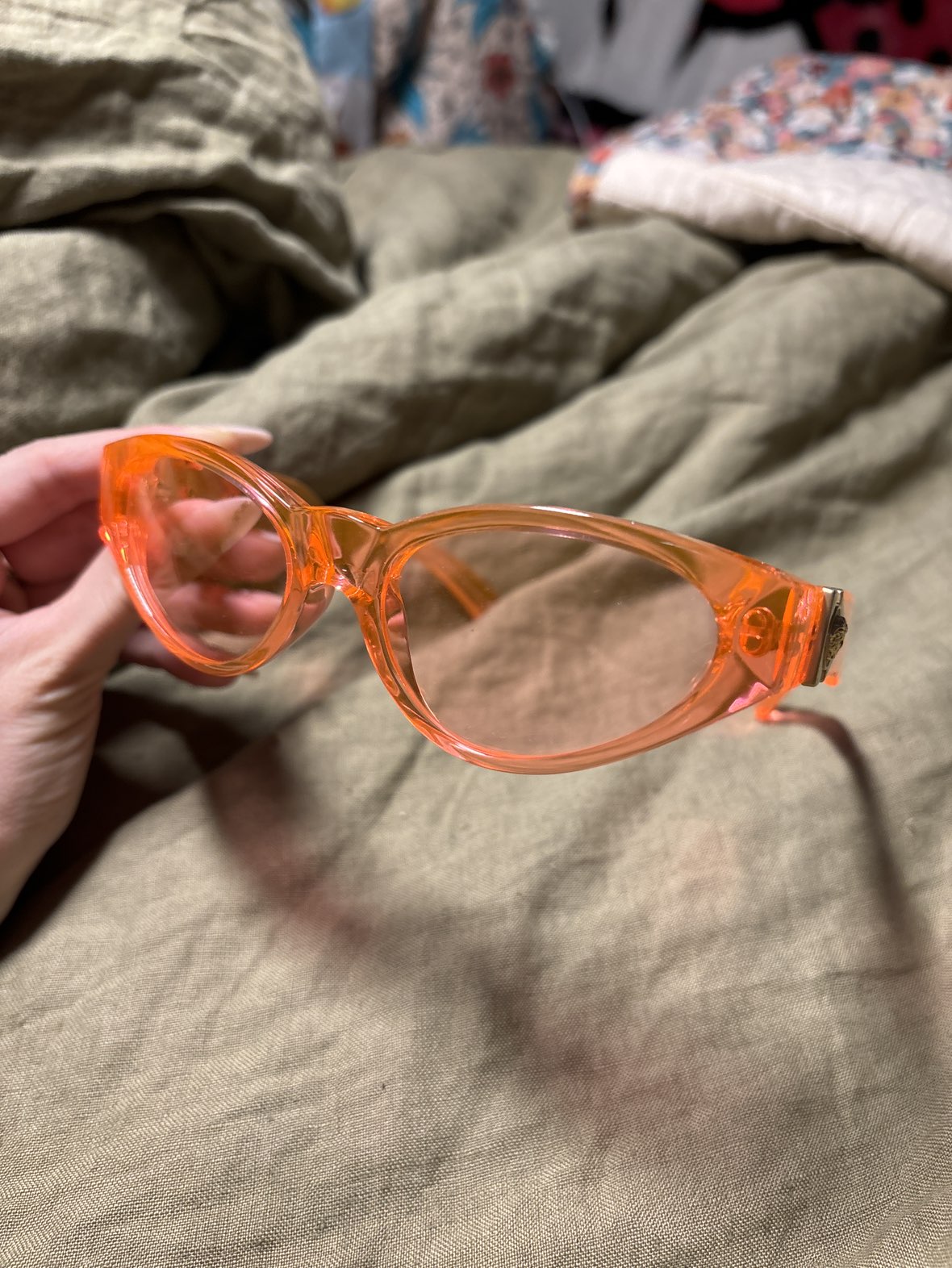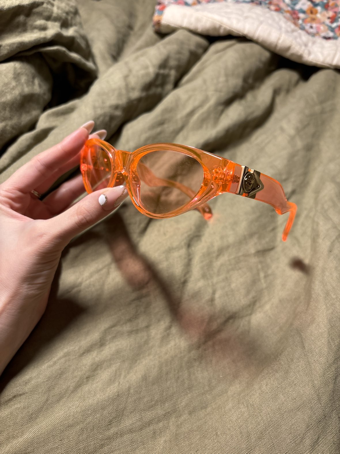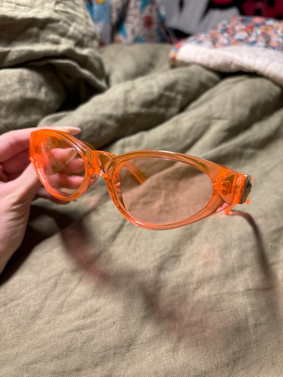 Versace original sunglasses. Pinky and orange, they are perfect for every season. I been having them for a couple of years but I barely worn them. If you want to have them in original Versace case it’s going to be 15$+ I just use this Versace case for my new glasses