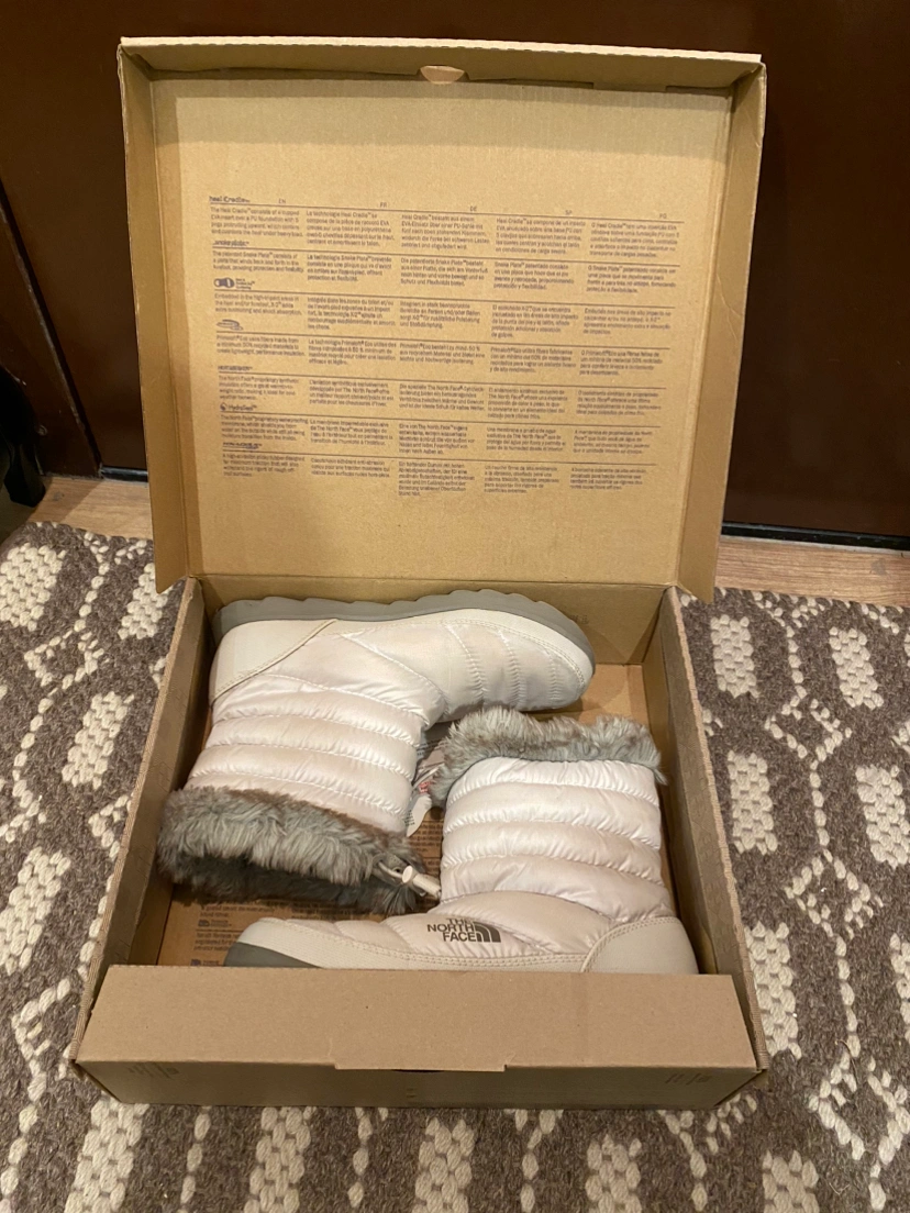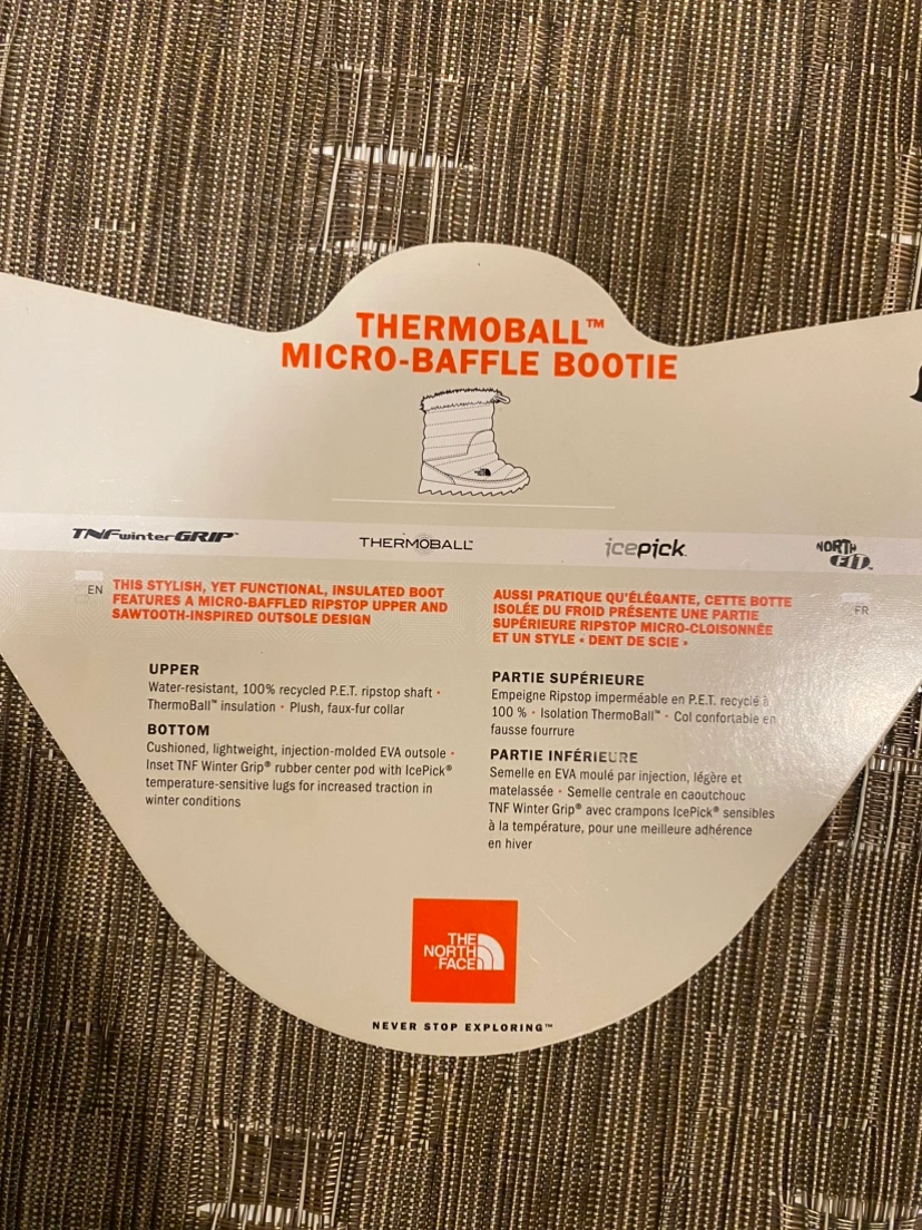 Water resistant, Thermoball insulation, faux fur collar, light weight, temperature-sensitive lugs.