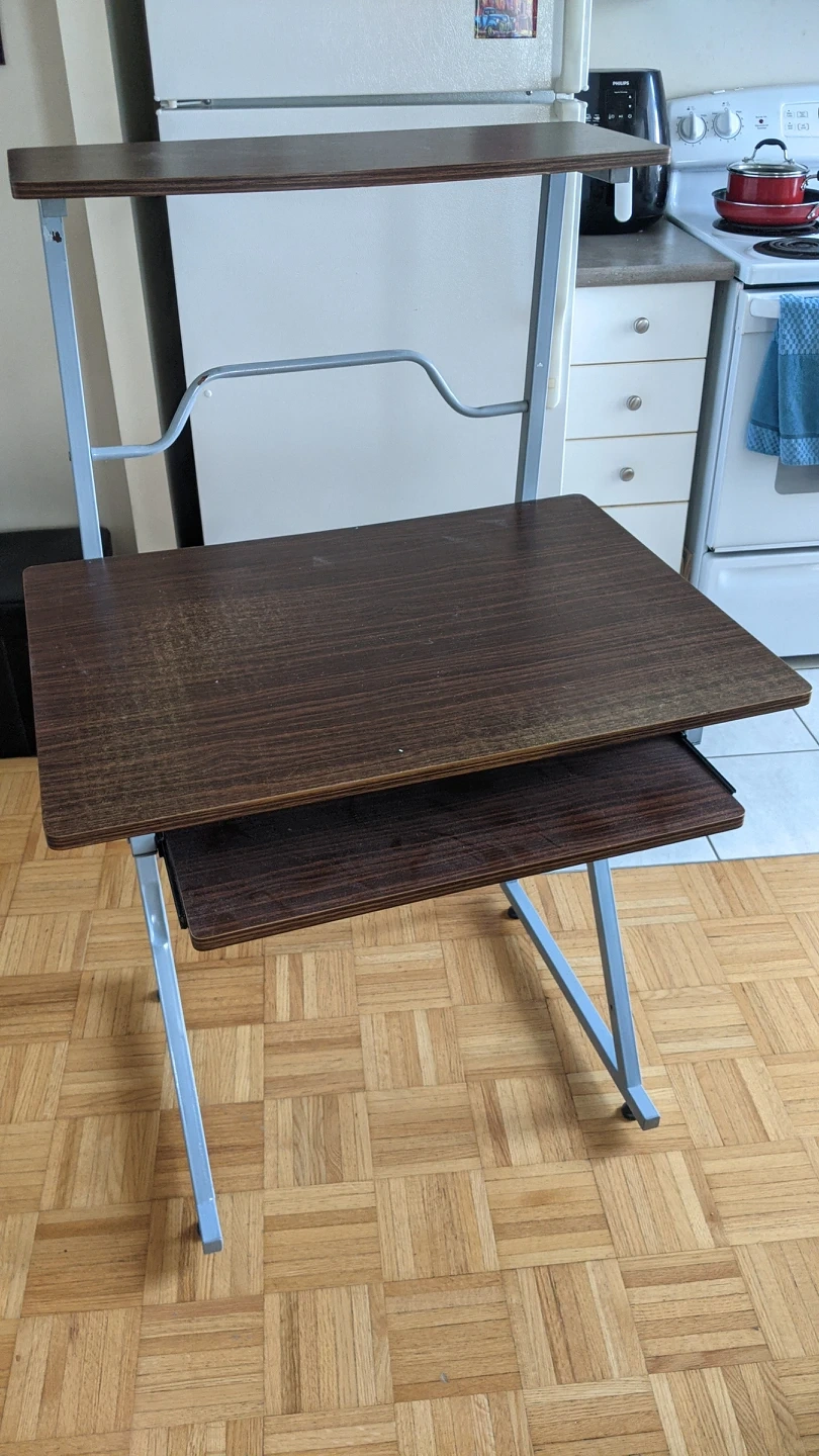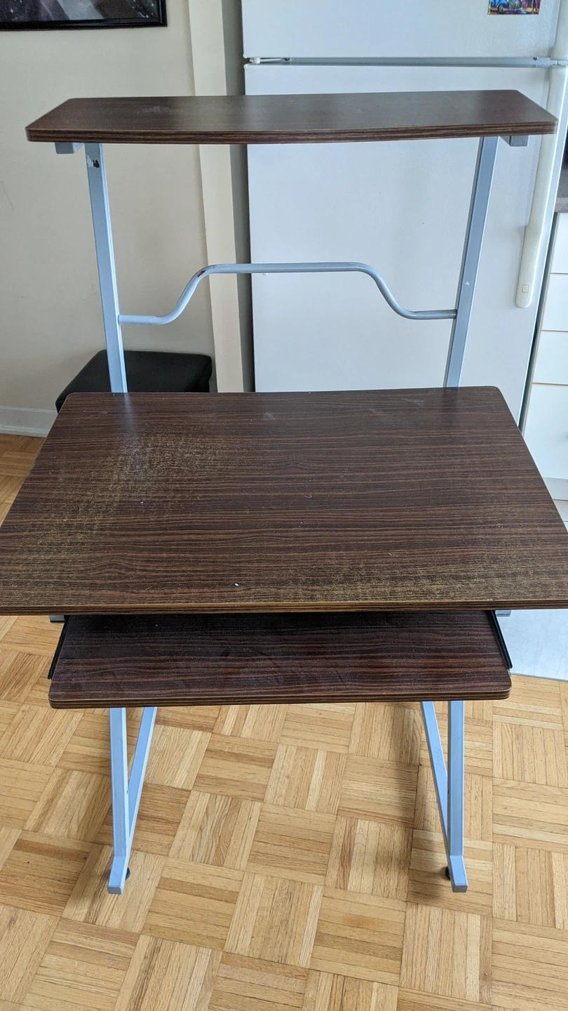 - Compact computer desk with top shelf (detachable) and retractable keyboard panel.