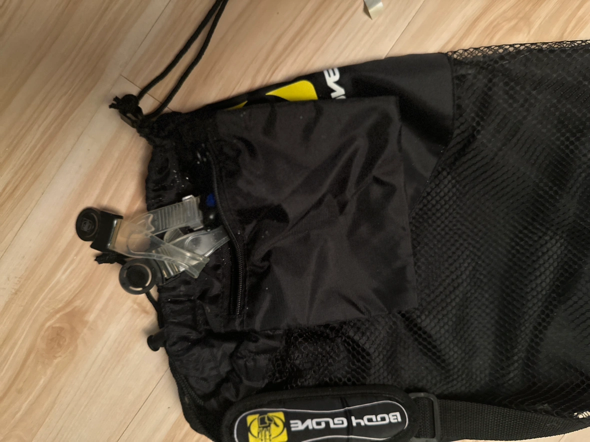 Great snorkel set, used 2 times then stored in climate controlled area. Goggles have quick release buttons on straps. Find come with M insert remove for L. Comes with strapped bag with inner bag for goggles and separate bag for strap (no scratches. Snorkel has the water lock so while diving you won’t inhale water. Great set I just need to downsize and I never really used them (no vacationing)