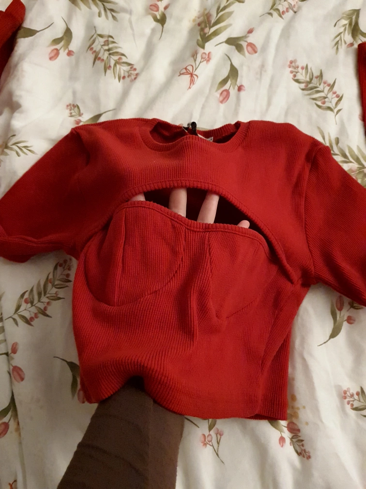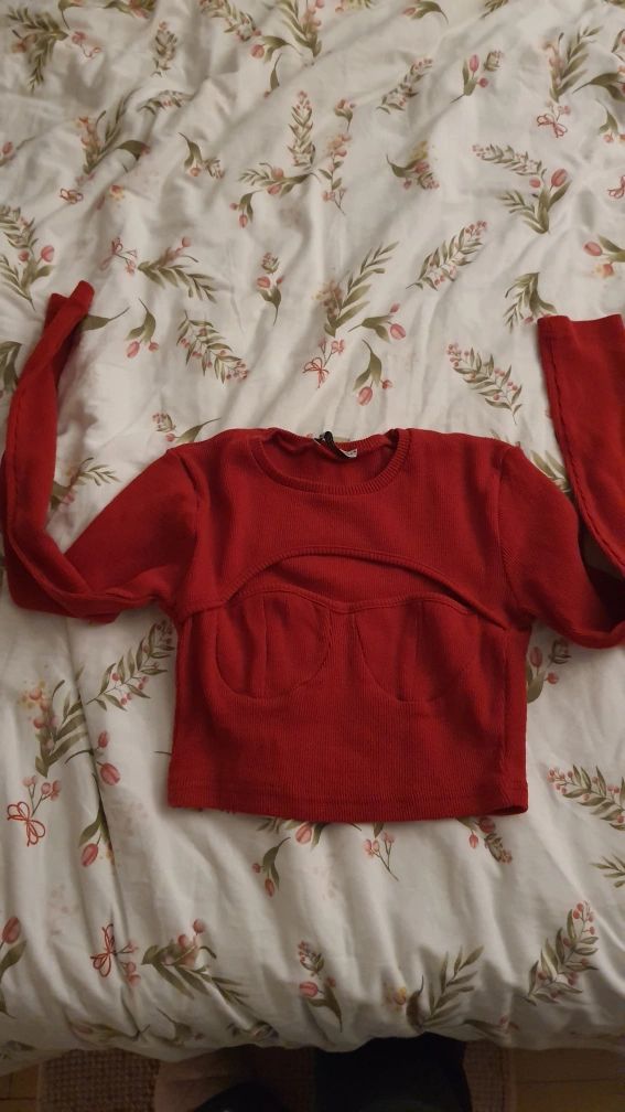 This is a red top with long sleeves. It has a cute window in the front (you can see in the picture). It's very cute but I don't wear a lot of red, so I never wore it out.