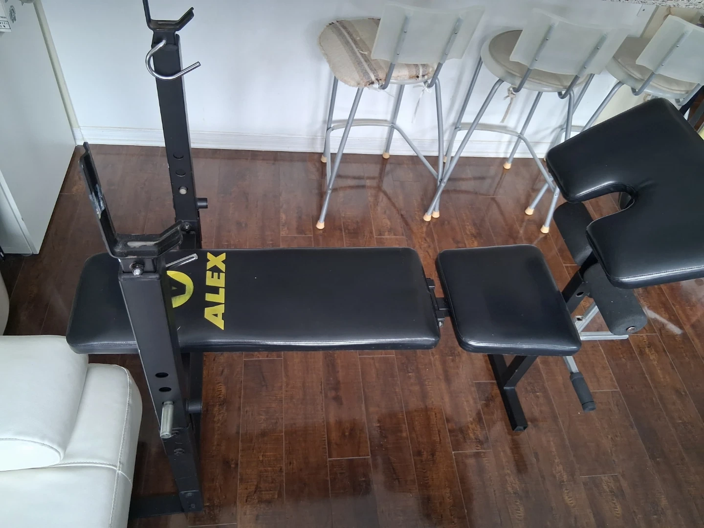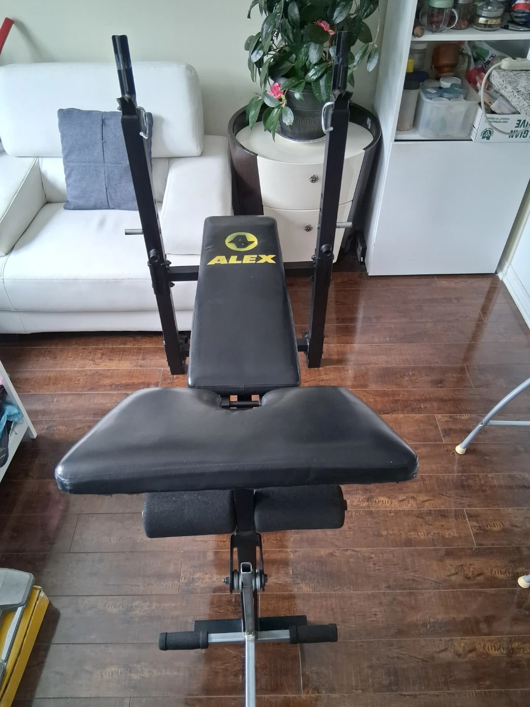 Alex weight bench for your home gym. It's black with yellow branding. Offers adjustable back and leg support. Pu near jane st and rutherford rd vaughan
