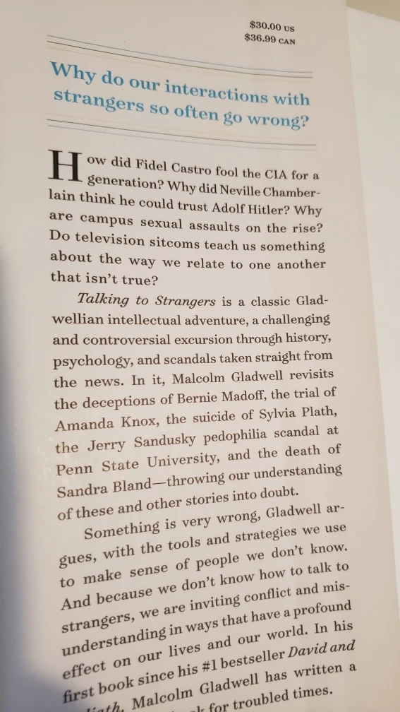 Talking to Strangers is an excursion through history, psychology, and scandals.He revisits the deceptions of Bernie Madoff, the trial of Amanda Knox, the suicide of Sylvia Plath, tthrowing our understanding of these and other stories into doubt. Something is wrong, with the tools and strategies we use to make sense of people we don't know. And because we don't know how to talk to strangers, we are inviting conflict and misunderstanding in ways that have a profound effect on our lives and our world. Gladwell has written a gripping guidebook for troubled times.