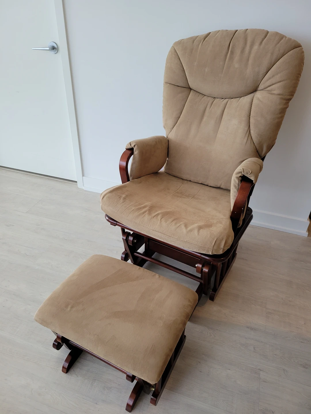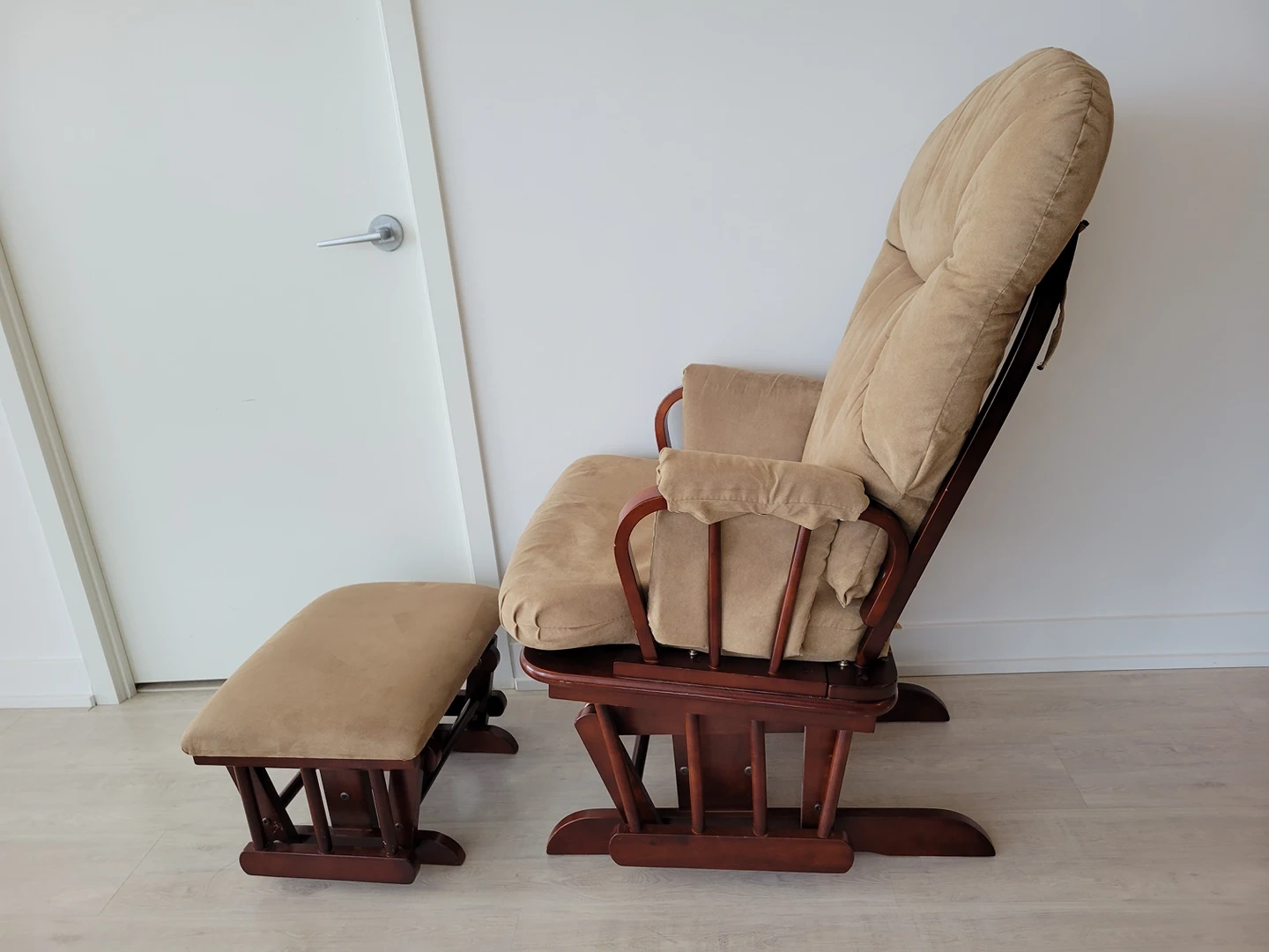 Very comfy rocking chair + foot stool, thick cushions are all removable and washable. Solid wood and rocking mechanisms running perfectly. Great for grabbing a cup of tea and read by the window :)