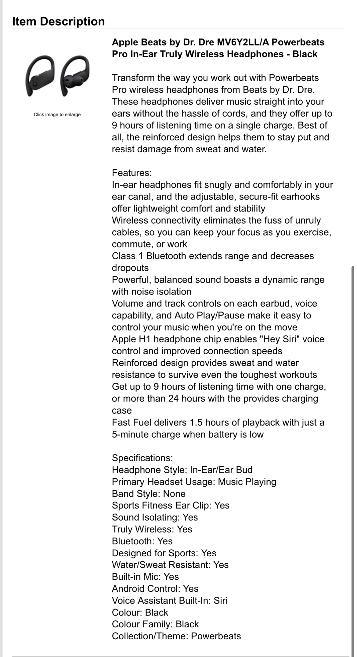 BRAND NEW IN BOX! MSRP $329.95 LIMITED MANUFACTURE WARRANTY INCLUDED UNTIL 11/2024!! First come first serve or highest offer! (Listed price is minimum price) Included in box: Apple Beats by Dr. Dre MV6Y2LL/A Powerbeats Pro In-Ear Truly Wireless Headphones - Black Charging Case Charging cable Quick Start Guide Warranty and safety guide 1 pair of ear tips Sticker spare ear tips At the time of testing, no faults were found and unit is fully functional. The battery life cannot be guaranteed. OEM box is included. See last image for full details and specifications. **Delivery & shipping is possible depending on location and small fee. Shipping fees must be paid by you** https://www.apple.com/ca/shop/product/MY582LL/A/powerbeats-pro-true-wireless-earbuds-black