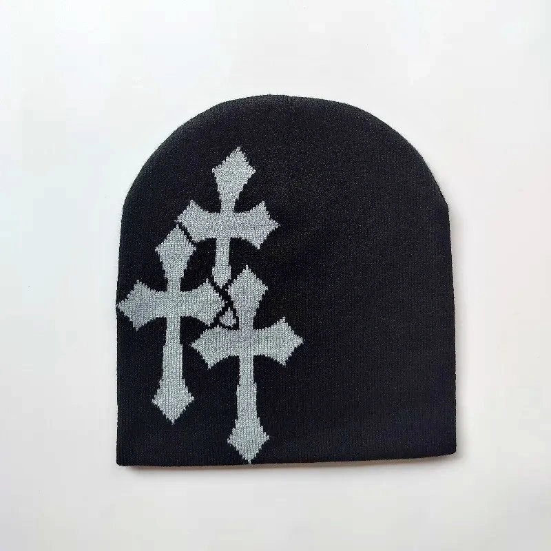 Black Gothic Cross Beanie – Streetwear Winter Hat