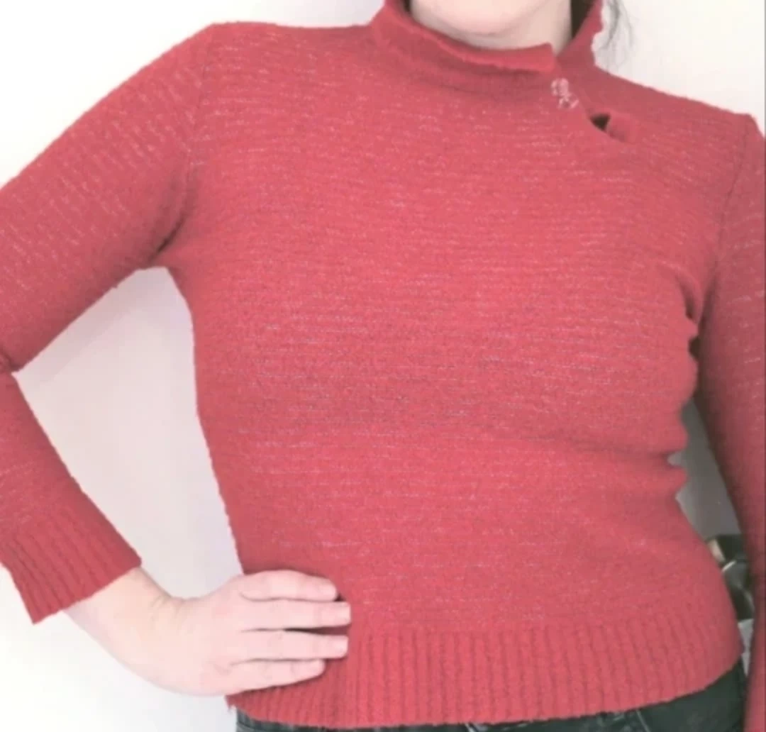 Channel your inner Joan Holloway with this high collar wool/acrylic sweater in a shade of poppy. Buttons offer an adjustable collar for comfort. It has never been worn out before. I can confirm it's genuine vintage.